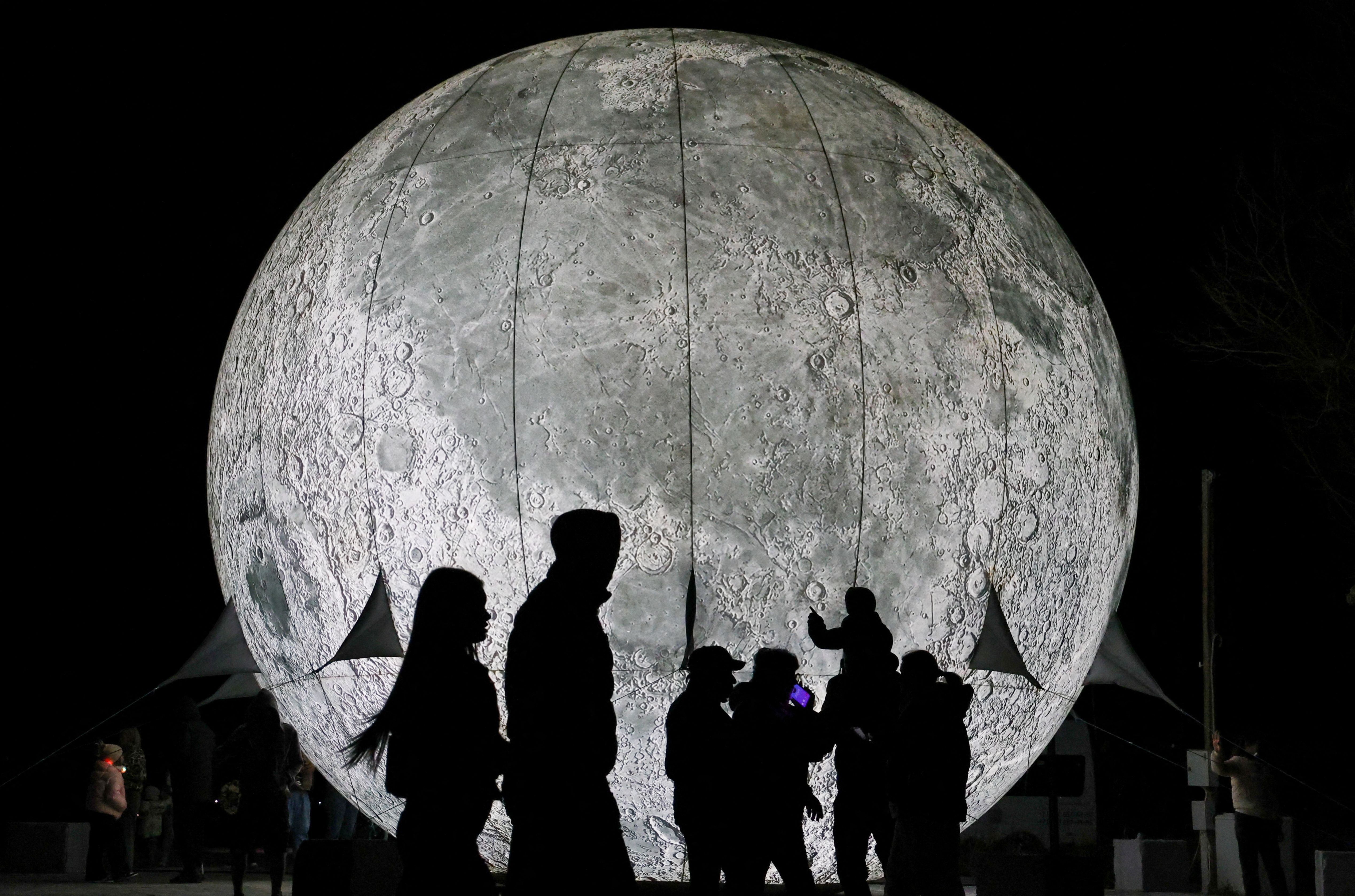 People gather near a giant inflatable in the shape of the moon installed to mark Cosmonautics Day in the Black Sea port city of Yevpatoriya, Crimea on April 14, 2025. (Photo by Alexey Pavlishak/Reuters)