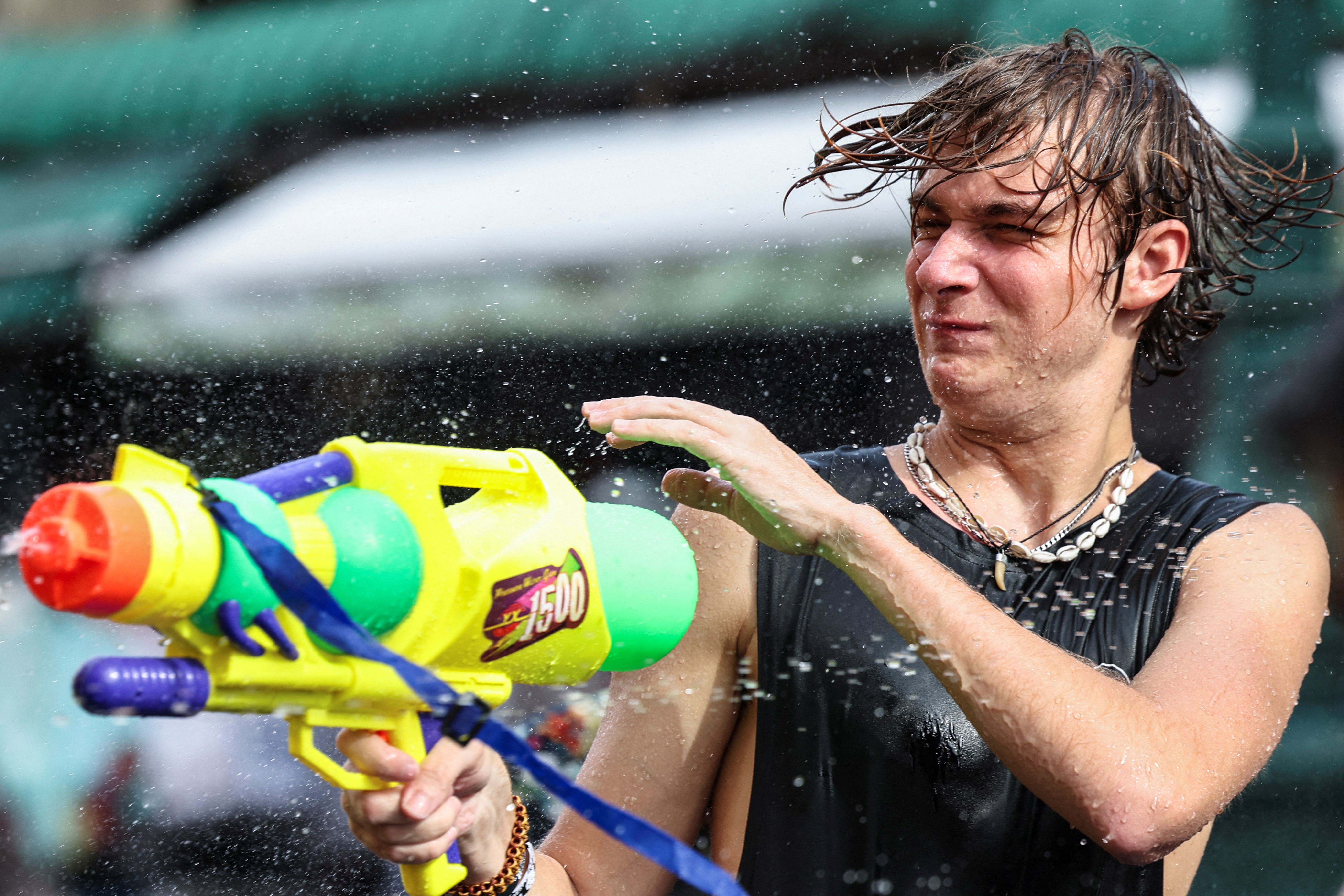 A reveller plays with a water gun as he celebrates the Songkran holiday, which marks the Thai New Year, in Bangkok, Thailand, on April 12, 2025. (Photo by Chalinee Thirasupa/Reuters)