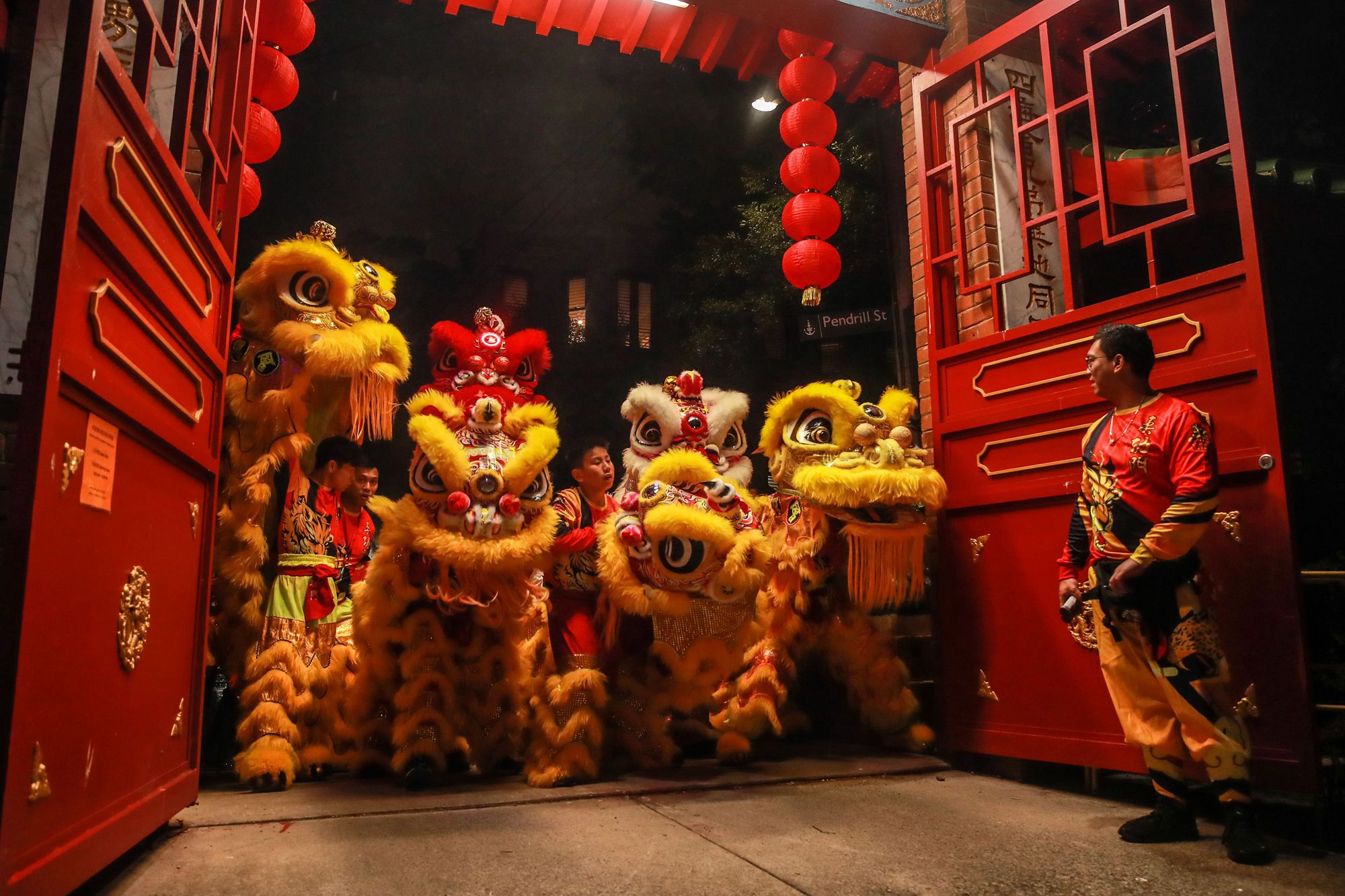 Lion dance group from Australian Yau Kung Mun Association prepare before perform at Sze Yup Kwan Ti temple during Lunar New Year's Eve celebration on February 09, 2024 in Sydney, Australia. Lunar New Year was observed at the heritage-listed Sze Yup Kwan Ti temple in inner-west Sydney. The Taoist temple in Glebe dates back to 1898 and is one of only four pre-WWI Chinese temples still active in Australia. The temple hosted a traditional lion dance to welcome in the Year of the Dragon on the eve of Lunar New Year, also known as Chinese New Year. The day is celebrated around the world, and The Year of the Wood Dragon in 2024 is associated with growth, progress, and abundance, as wood represents vitality and creativity, while the dragon symbolizes success, intelligence, and honor. (Photo by Roni Bintang/Getty Images)