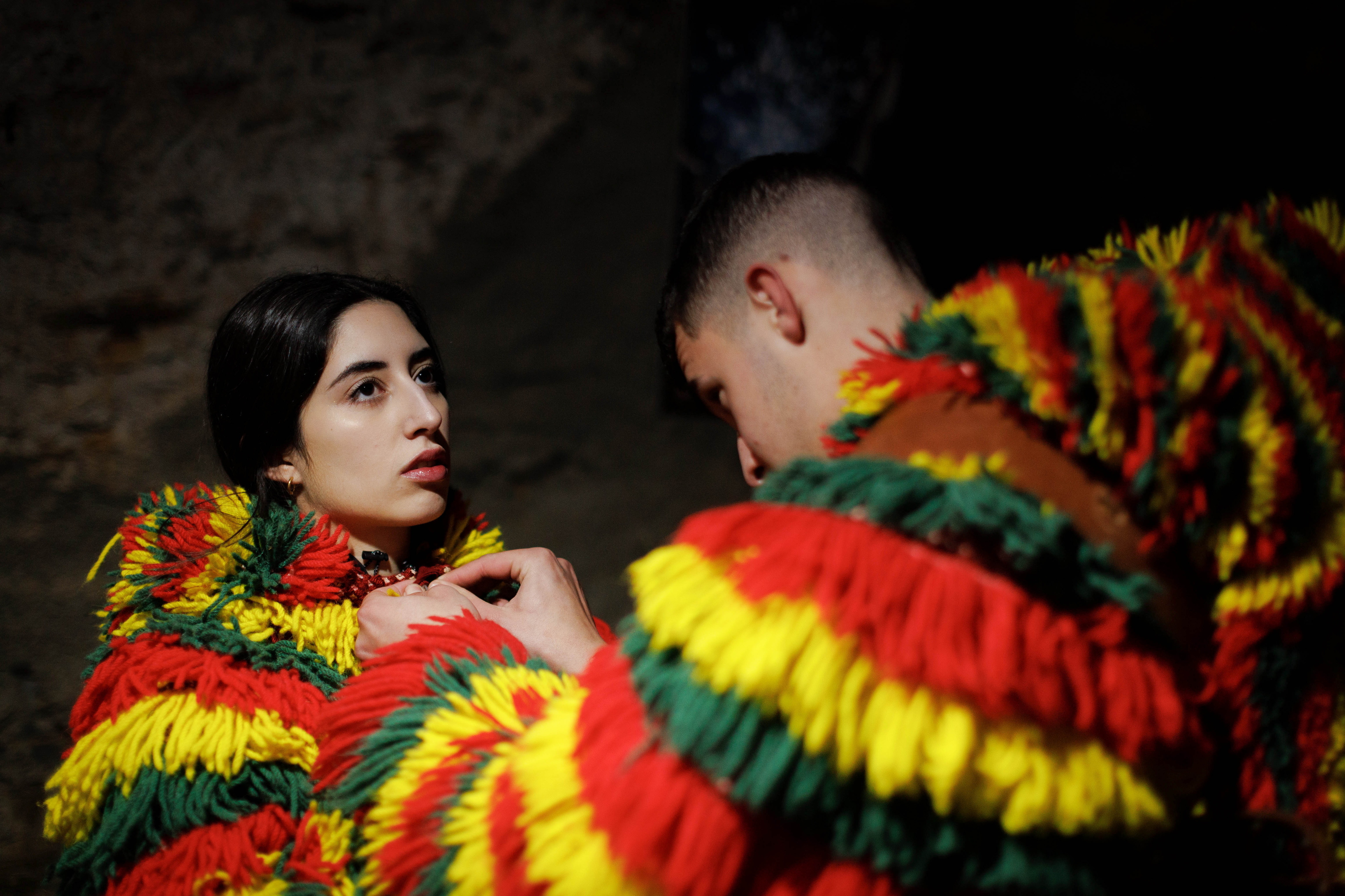 Participants dressed as “Caretos'” during the carnival festivities of Podence, municipality of Macedo de Cavaleiros, Portugal, 11 February 2024. Every year, during carnival, the Caretos de Podence – masked boys in costumes with colourful fringes, pointed-nosed faces made of tin or leather and rattles around their waists – roam the streets of the town making noise and picking on people passing by, especially girls. (Photo by Pedro Sarmento Costa/EPA)