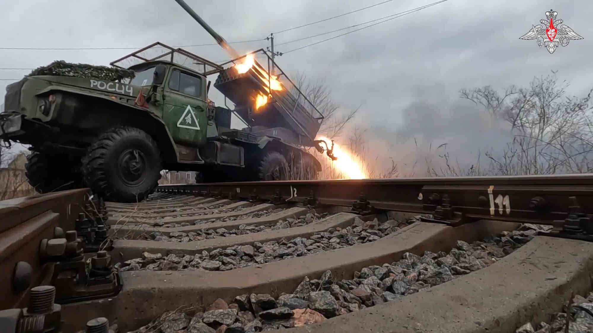 In this photo taken from video and released by Russian Defense Ministry Press Service on Thursday, February 8, 2024, a rocket is fired from the Russian army's Grad rocket launchers at an undisclosed location in Ukraine. (Photo by Russian Defense Ministry Press Service via AP Photo)