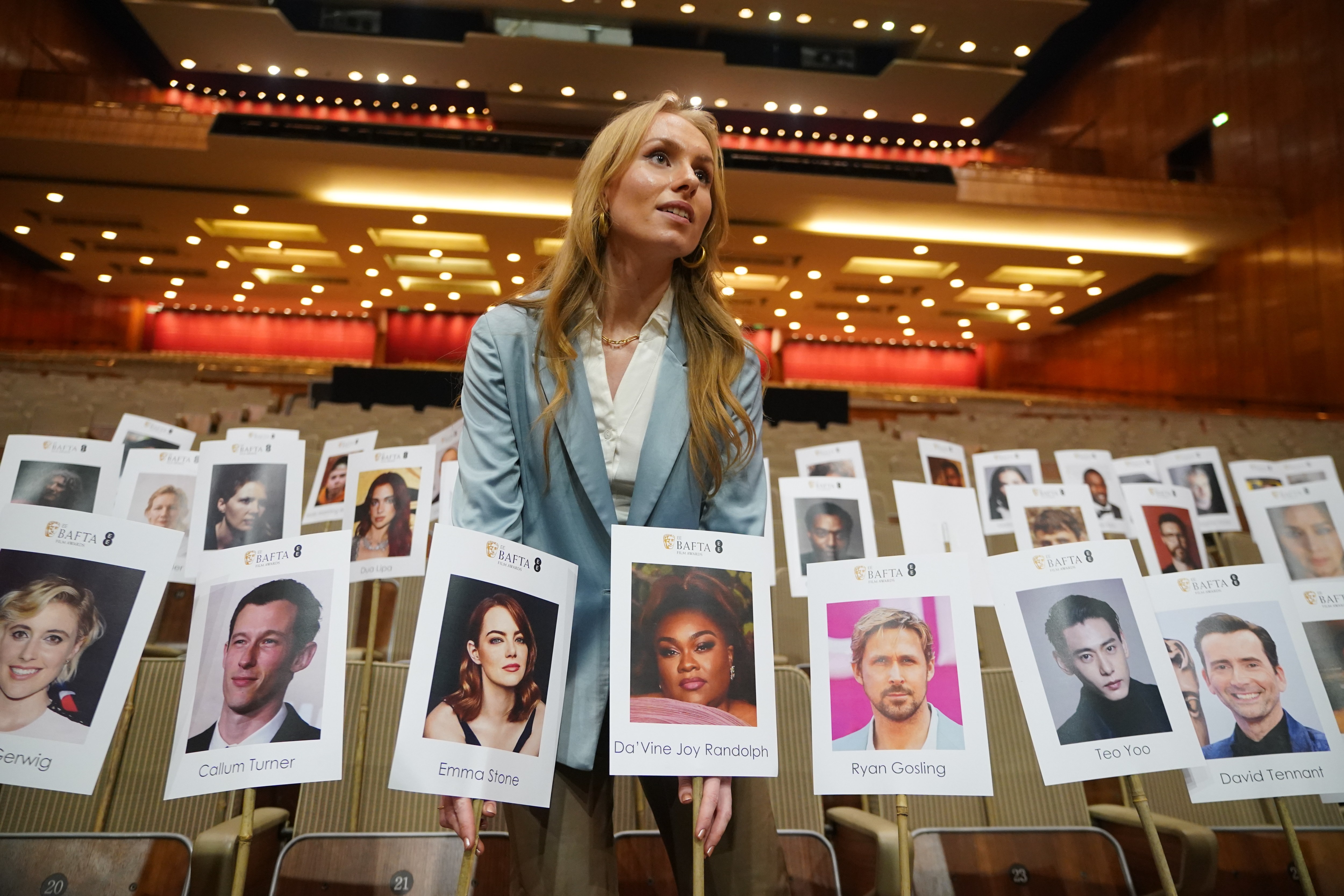 A staff member uses “heads on sticks” to check camera blocking at the Royal Festival Hall in London on Monday, February 12, 2024, ahead of the EE BAFTA Film Awards on Sunday.(Photo by Yui Mok/PA Images via Getty Images)