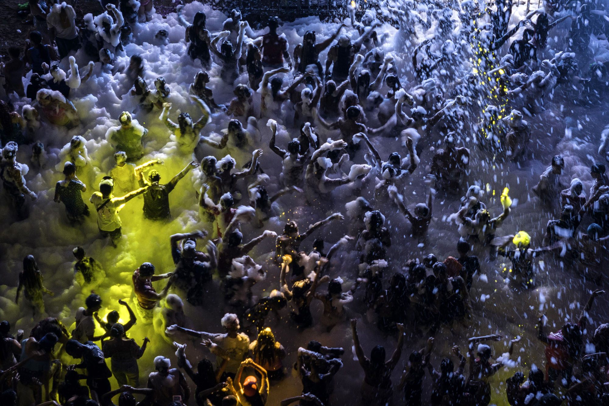 In this aerial view, Revelers dance while covered in foam spray during Carnival celebrations on February 12, 2024 in Esmeraldas, Ecuador. Violent crime has dropped nationwide, according to the government, in the month since Ecuador's President Daniel Noboa declared a state of “internal armed conflict” to fight surging gang violence. National Police and armed forces have arrested more than 7,000 people around the country. The government has labeled 22 gangs in Ecuador as terrorist organizations. In Esmeraldas Province on Ecuador's Pacific coast authorities allowed official Carnival events to resume this year due to the improved security situation after having cancelled main events in recent years due to widespread drug-related violence, extortion and death threats to residents. The instability forced many people to move to safer parts of Ecuador or emigrate abroad, many to the United States. (Photo by John Moore/Getty Images)