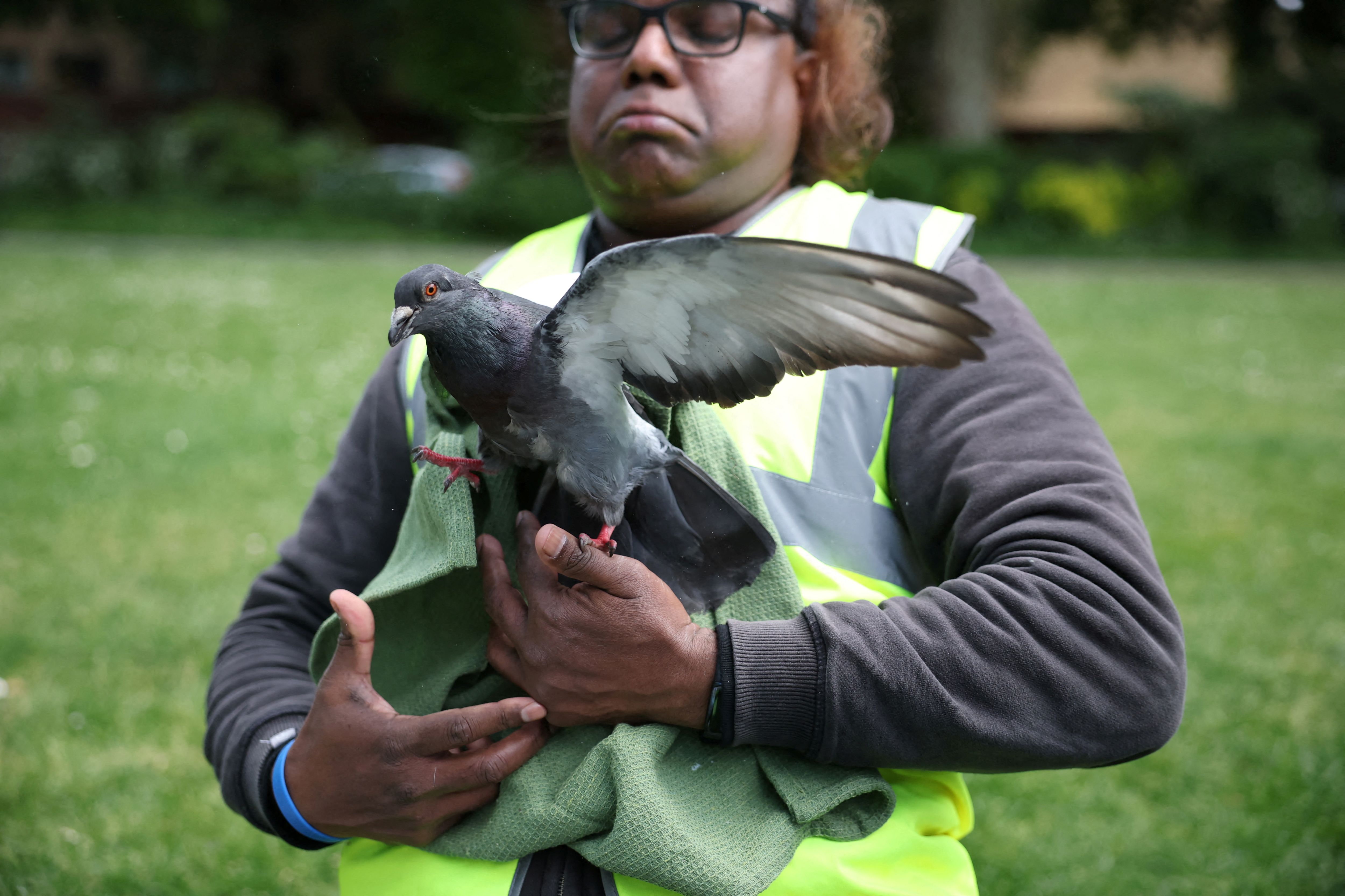 Jacob Peter, a volunteer with London Pigeon Rescue, releases a Pigeon during checks of birds in a park in the Hackney area of London, Britain, on May 7, 2025. (Photo by Phil Noble/Reuters)