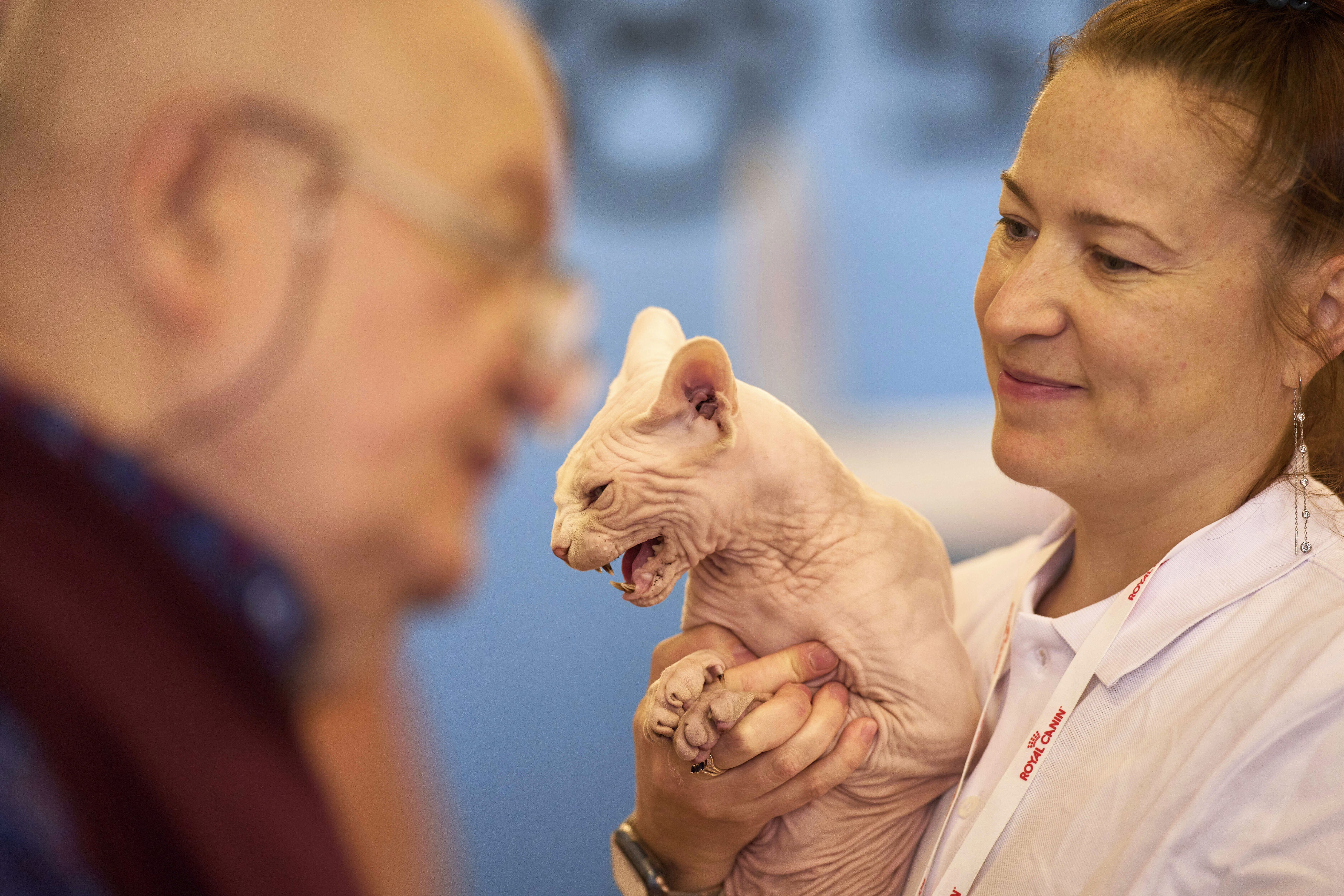 Bismarck the Sphinx cat hisses while being held by its owner Anastasia before a judge during an international feline beauty competition in Bucharest, Romania, Saturday, May 10, 2025. (Photo by Vadim Ghirda/AP Photo)