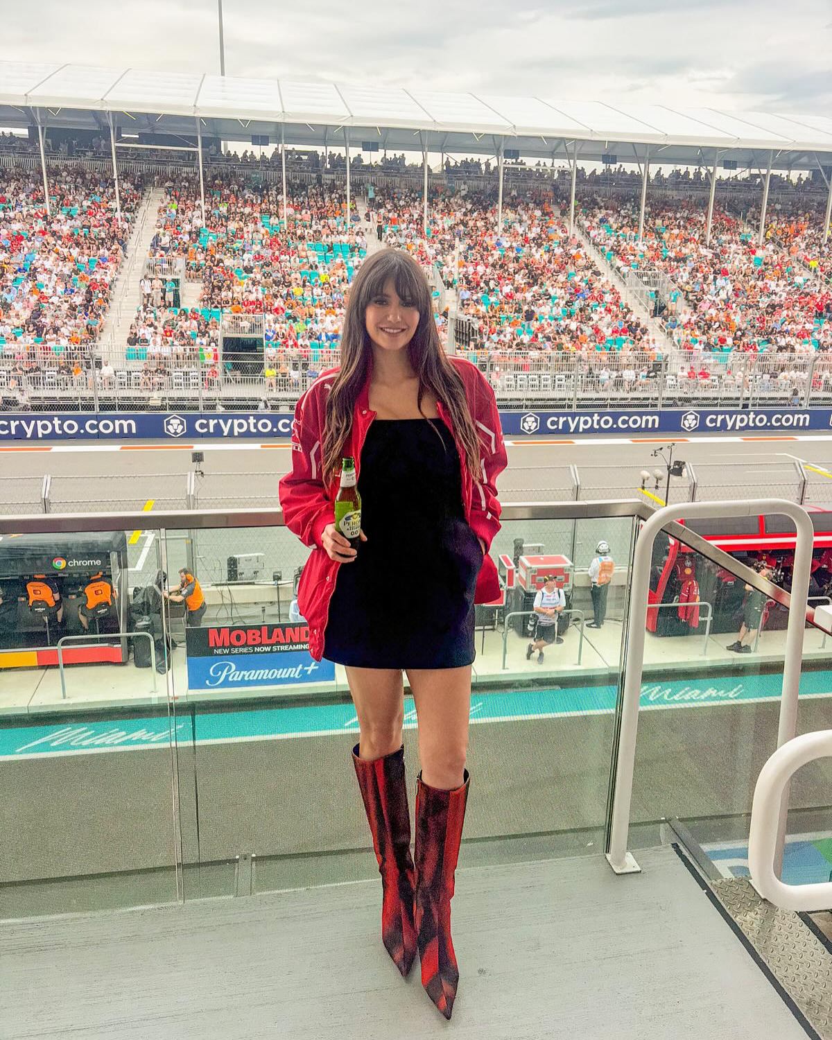 Canadian actress Nina Dobrev shows off her stylish fit while out at the F1 races on May 6, 2025. (Photo by nina/Instagram)