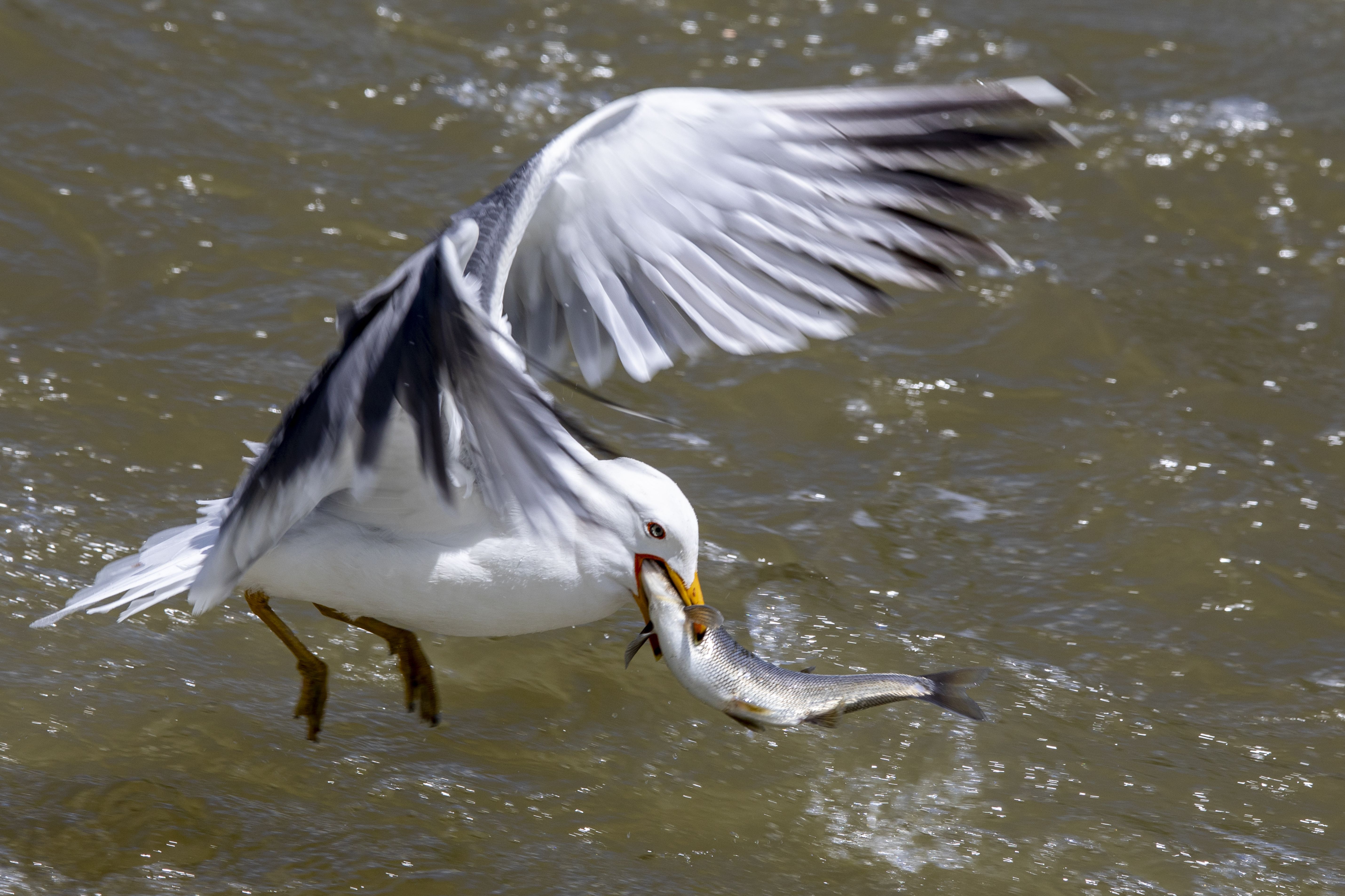 A seagull hunts pearl mullets swimming upstream against the flow stream in Van, Turkiye on May 10, 2025 as people observe their dangerous journey as part of the “12th International Pearl Mullet Migration Culture and Art Festival” organized to promote and raise awareness about the pearl mullets' migration during the breeding period. Every year during their spawning season, the pearl mullets live in the Lake Van, have to fight against seagulls feed on migrating fish, while migrating to fresh waters by swimming upstream against the flow stream. (Photo by Necmettin Karaca/Anadolu via Getty Images)