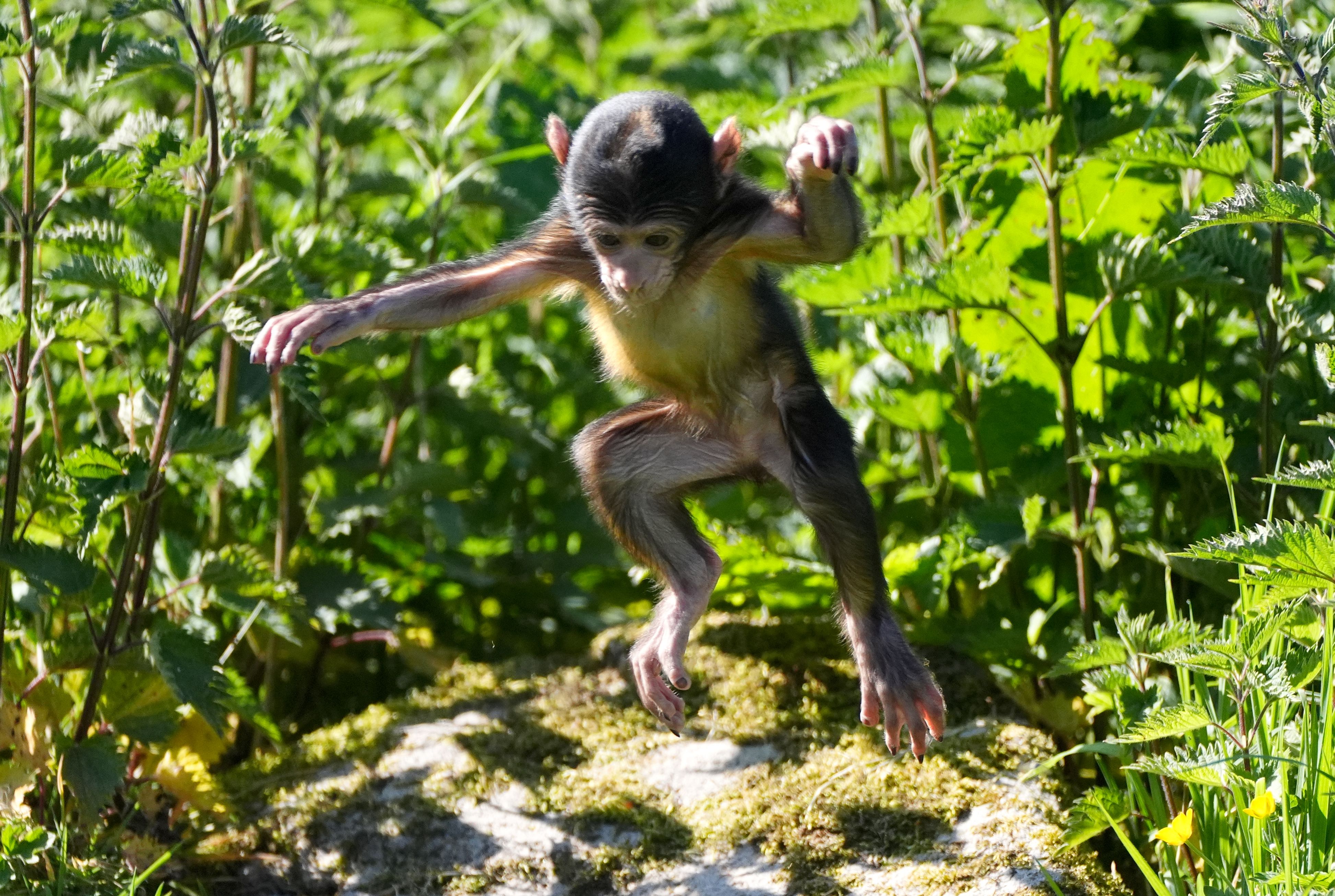 Iona the baby Barbary macaque one of two arrivals for the macaque troop at Blair Drummond Safari Park, Stirling, UK on Friday, May 16, 2025. Isaac, a male, was born on the April 9 to mum Marie Teresa, and Iona, a female was born to mum Wuwu on April 20. (Photo by Andrew Milligan/PA Wire)