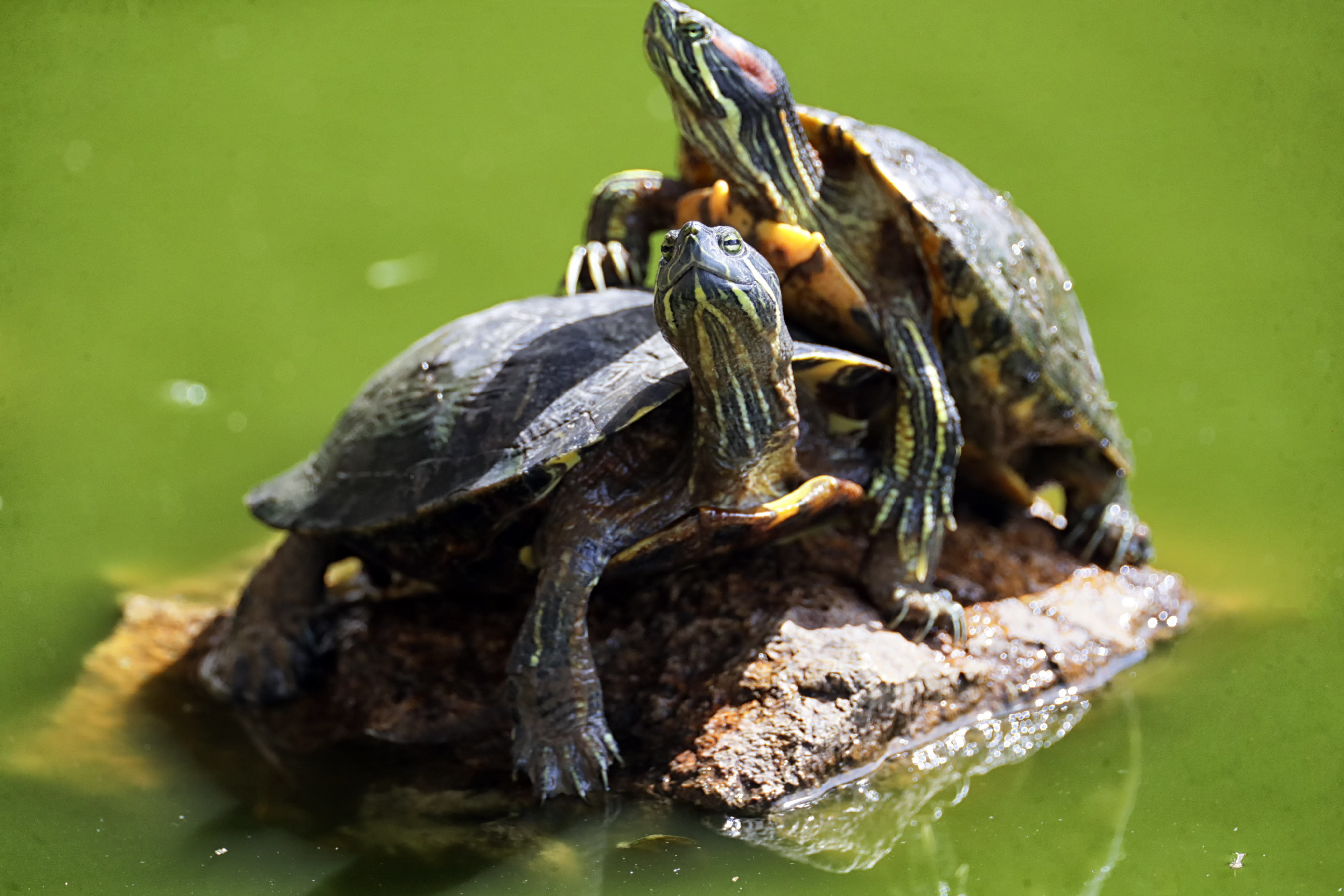Red-eared slider turtles (Trachemys scripta elegans) in a lagoon in the municipality of Santa Lucia, Honduras, 14 May 2025. (Photo by Gustavo Amador/EPA)