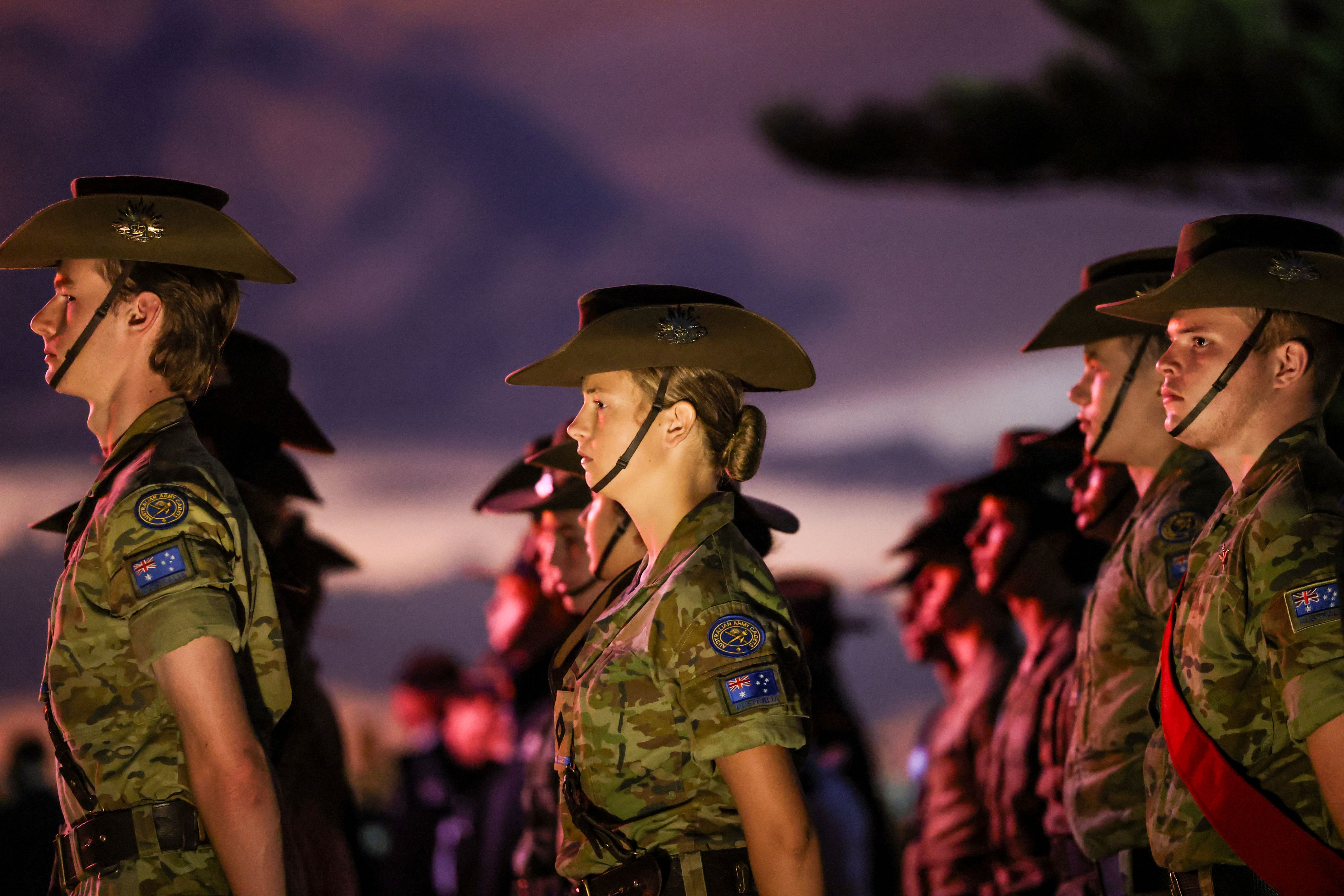 Members of the armed forces stand during the annual ANZAC (Australian and New Zealand Army Corps) Day dawn service at Coogee Beach in Sydney on April 25, 2025. Dawn services were held across the two countries on the anniversary of the ill-fated 1915 campaign of the Australian and New Zealand Army Corps that left 11,500 of them dead in what is now Turkey during World War I. (Photo by David Gray/AFP Photo)