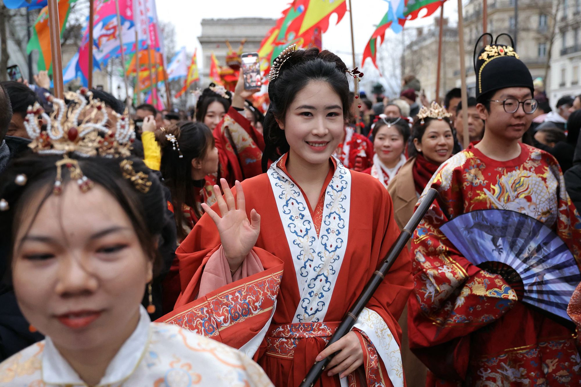 A member of the Chinese community takes part in a parade to celebrate the Chinese Lunar New Year on the Champs-Elysees in Paris on February 4, 2024. Chinese Lunar New Year starts on February 10, 2024 and will be the year of the Dragon. (Photo by Thomas Samson/AFP Photo)