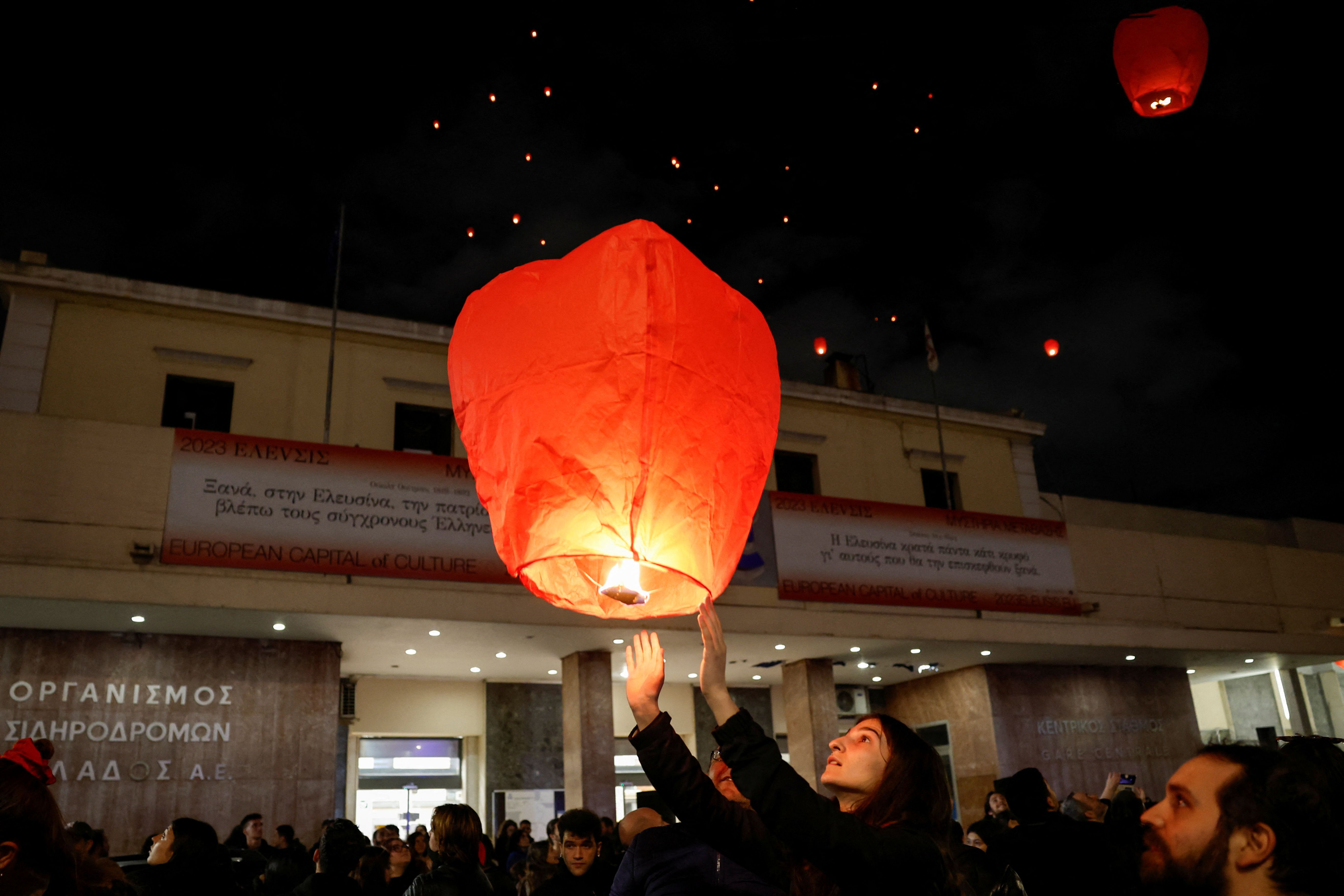 People release 57 hot-air lanterns in front of the main train station in Athens, to mark the one-year anniversary of a deadly train crash, which killed 57 people, in Athens, Greece, on February 28, 2024. (Photo by Louisa Gouliamaki/Reuters)