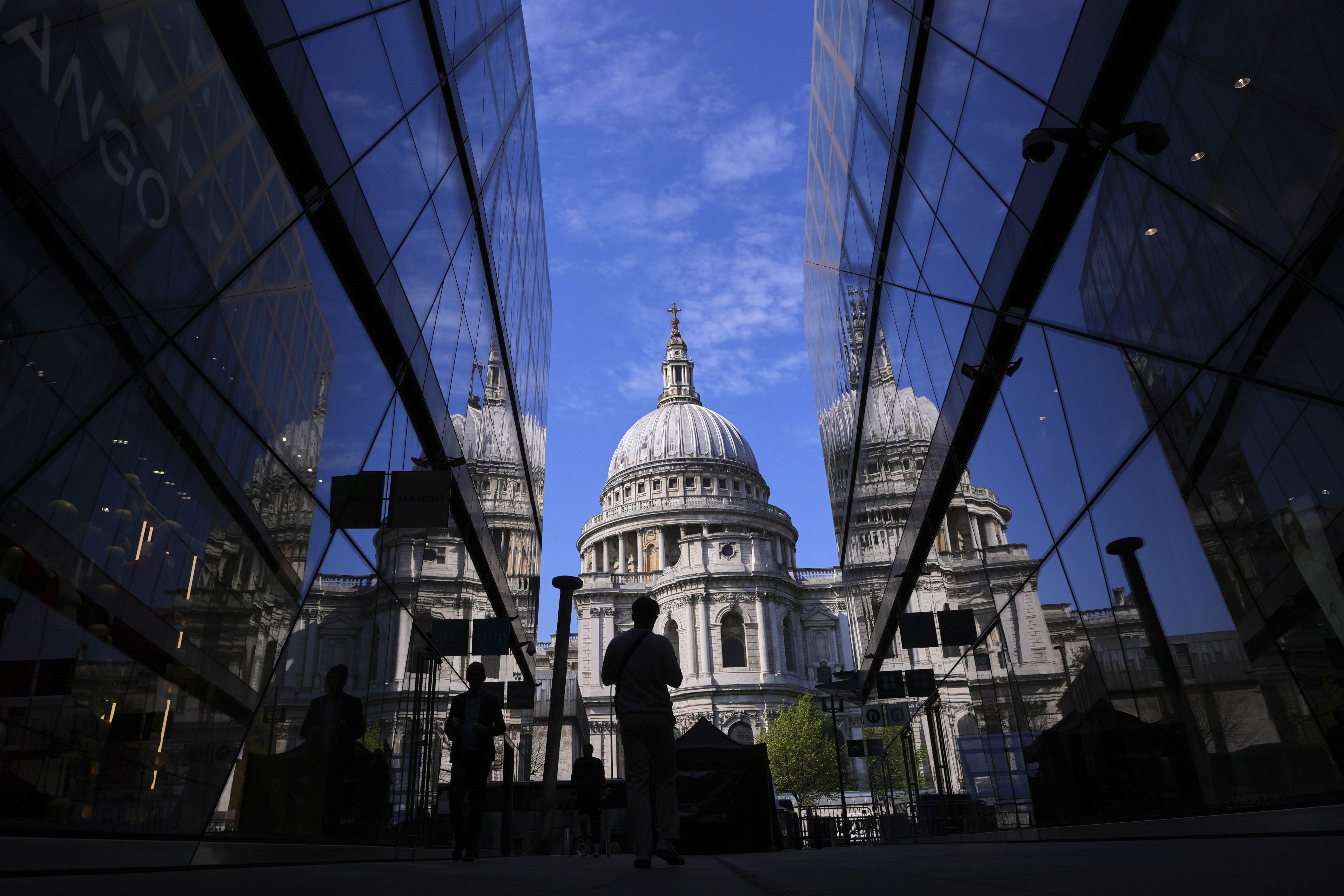 The blue sky above St Pauls Cathedral is reflected in windows in London, Thursday, April 3, 2025. (Photo by Kirsty Wigglesworth/AP Photo)