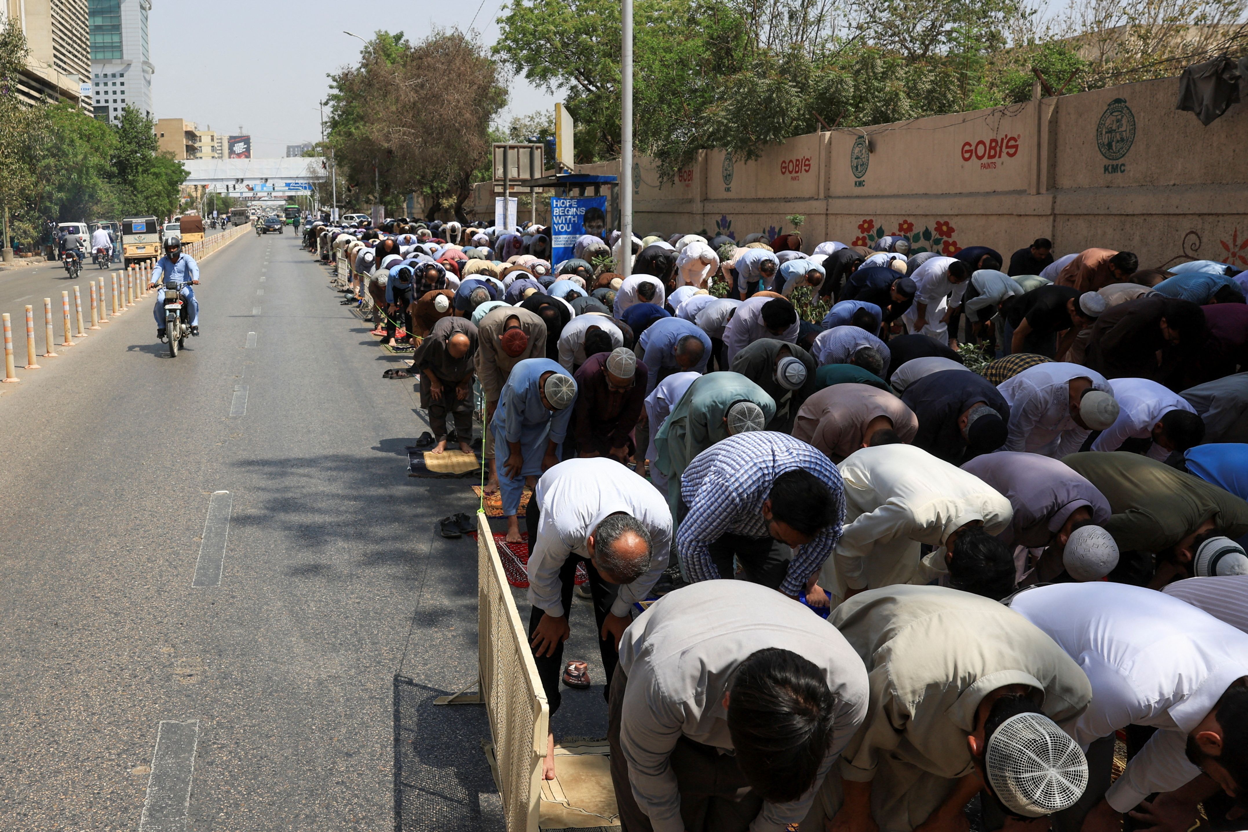 People attend Friday prayers during the Muslim holy month of Ramadan, outside a mosque, along a road in Karachi, Pakistan on March 21, 2025. (Photo by Akhtar Soomro/Reuters)