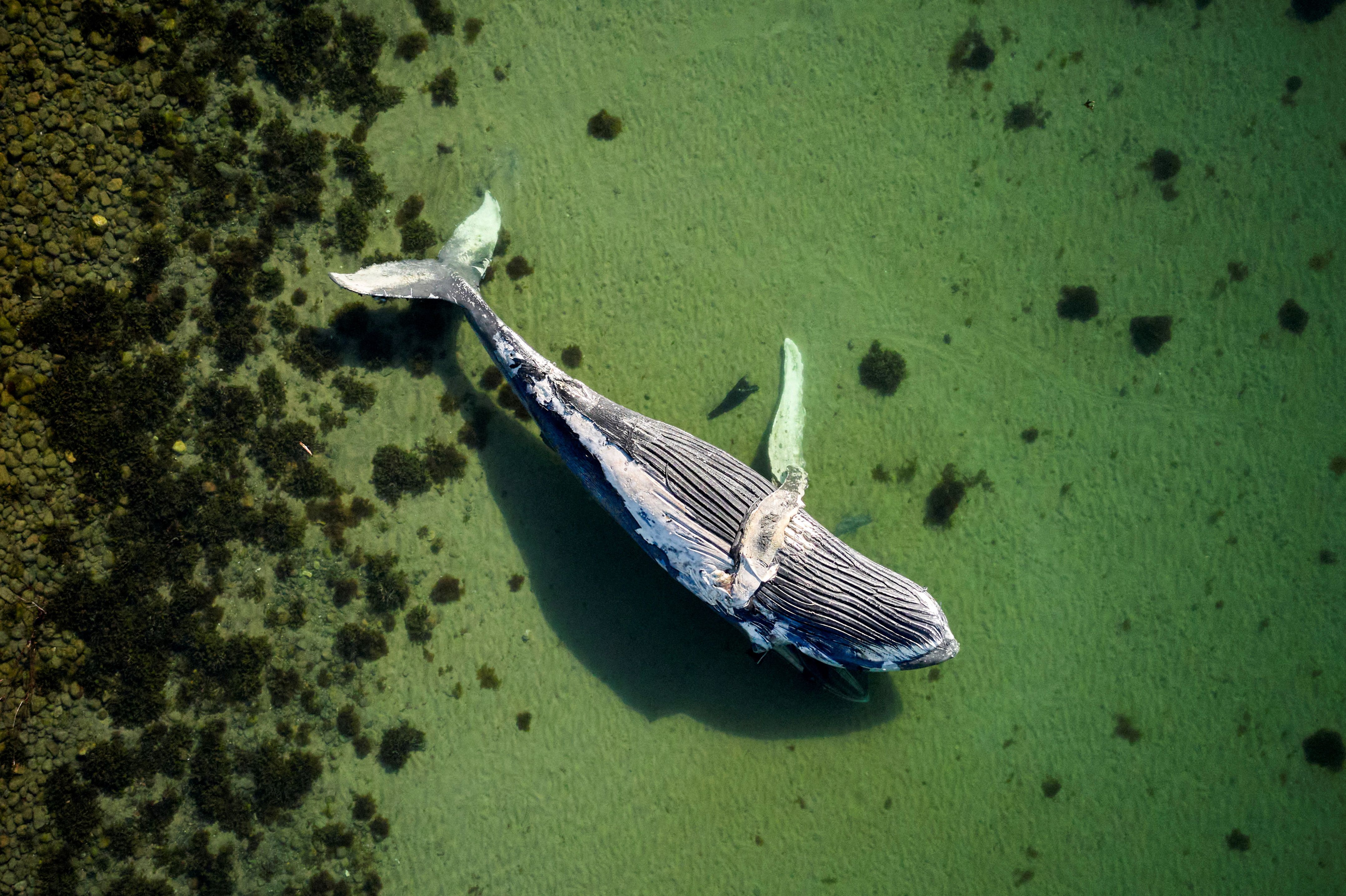 Drone photo of a dead humpback whale at Foelle Strand in Loegten Bay, Djursland, Denmark, on April 2, 2025. (Photo by Mikkel Berg Pedersen/Ritzau Scanpix via Reuters)