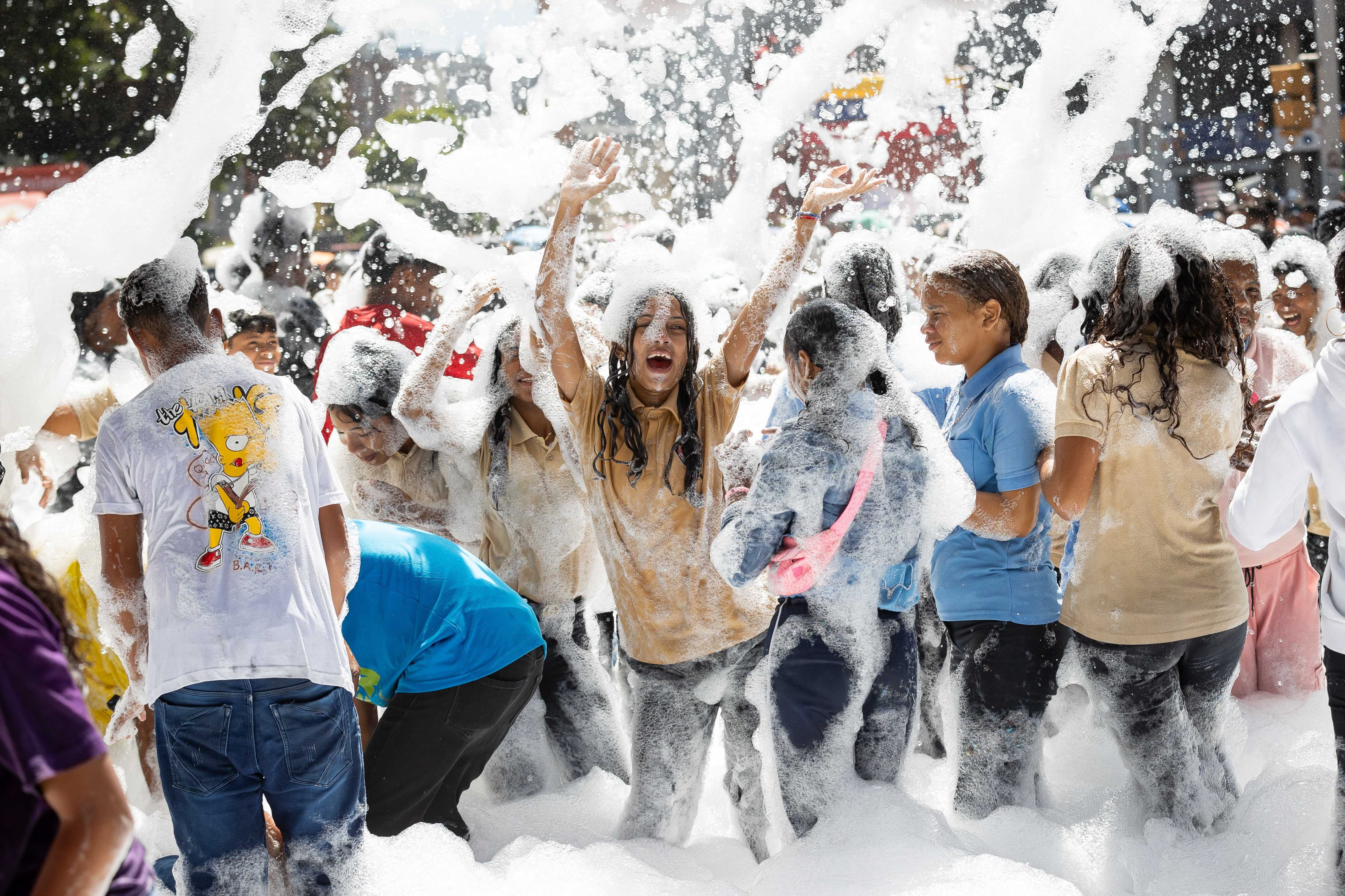 Young people play with foam during a march to commemorate Youth Day in Caracas, Venezuela, 12 February 2025. The president of Venezuela's National Assembly (AN, Parliament), Chavista Jorge Rodriguez, invited, before hundreds of followers who commemorated Youth Day, all young migrants to return to the country so that they can “build a prosperous homeland”. (Photo by Ronald Pena R./EPA)