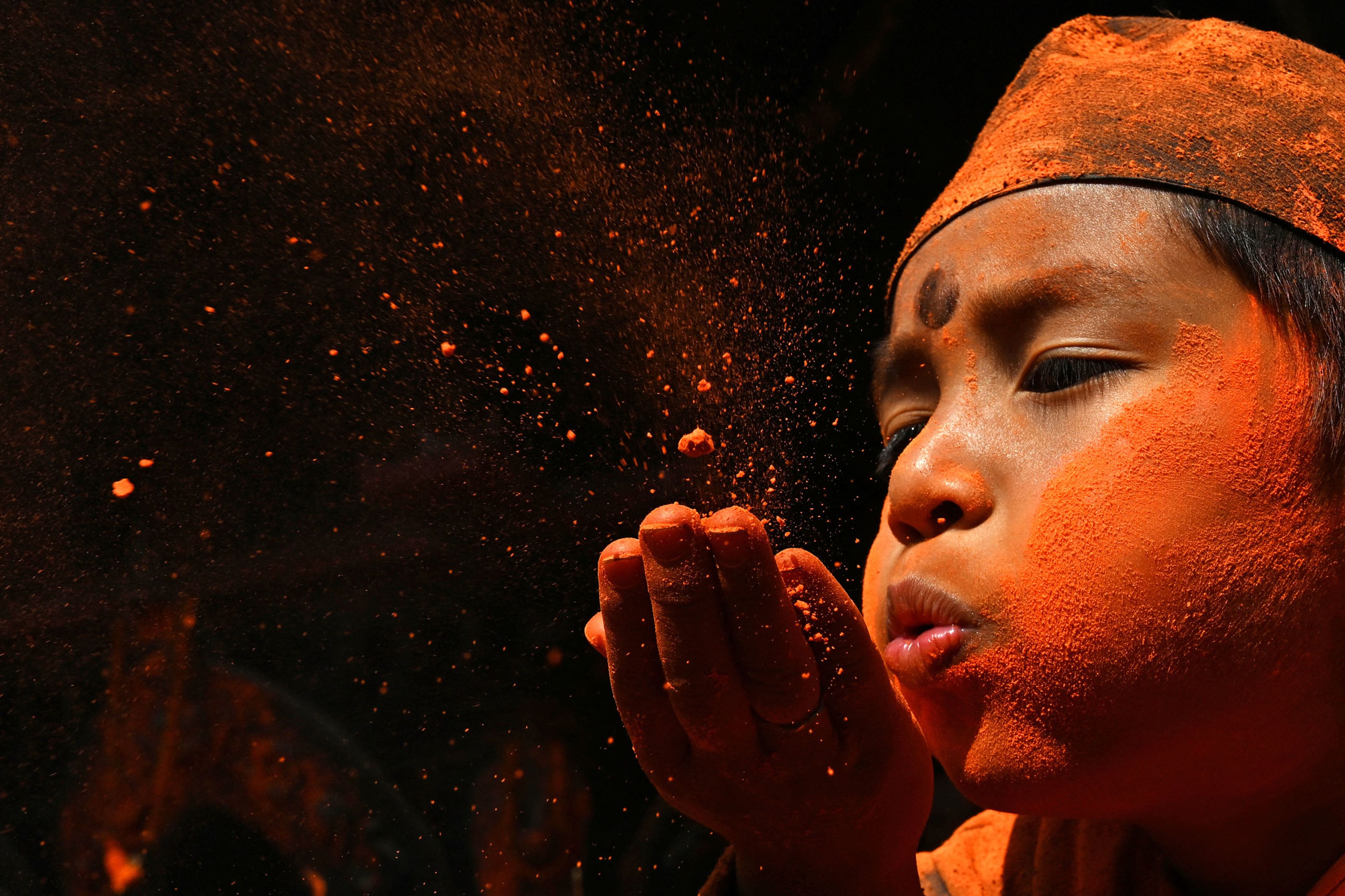 A person smeared in vermilion powder celebrates the Bisket Jatra festival in Thimi, Nepal, on Tuesday, April 15, 2025. (Photo by Prakash Mathema/AFP Photo)