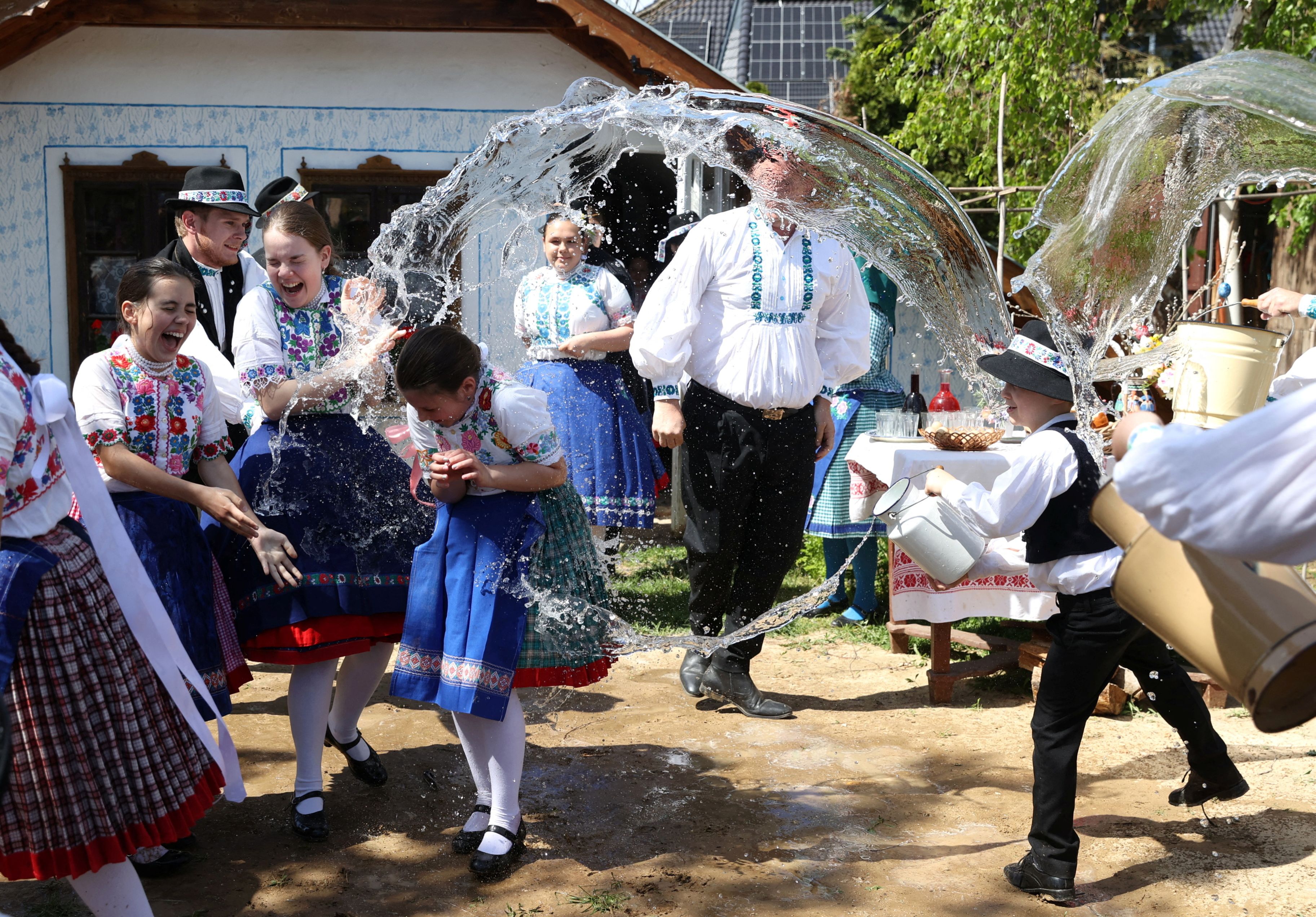 Young girls dressed in traditional clothes react as men throw water at them during a traditional Easter celebration in Csomor, Hungary, on April 21, 2025. (Photo by Bernadett Szabo/Reuters)