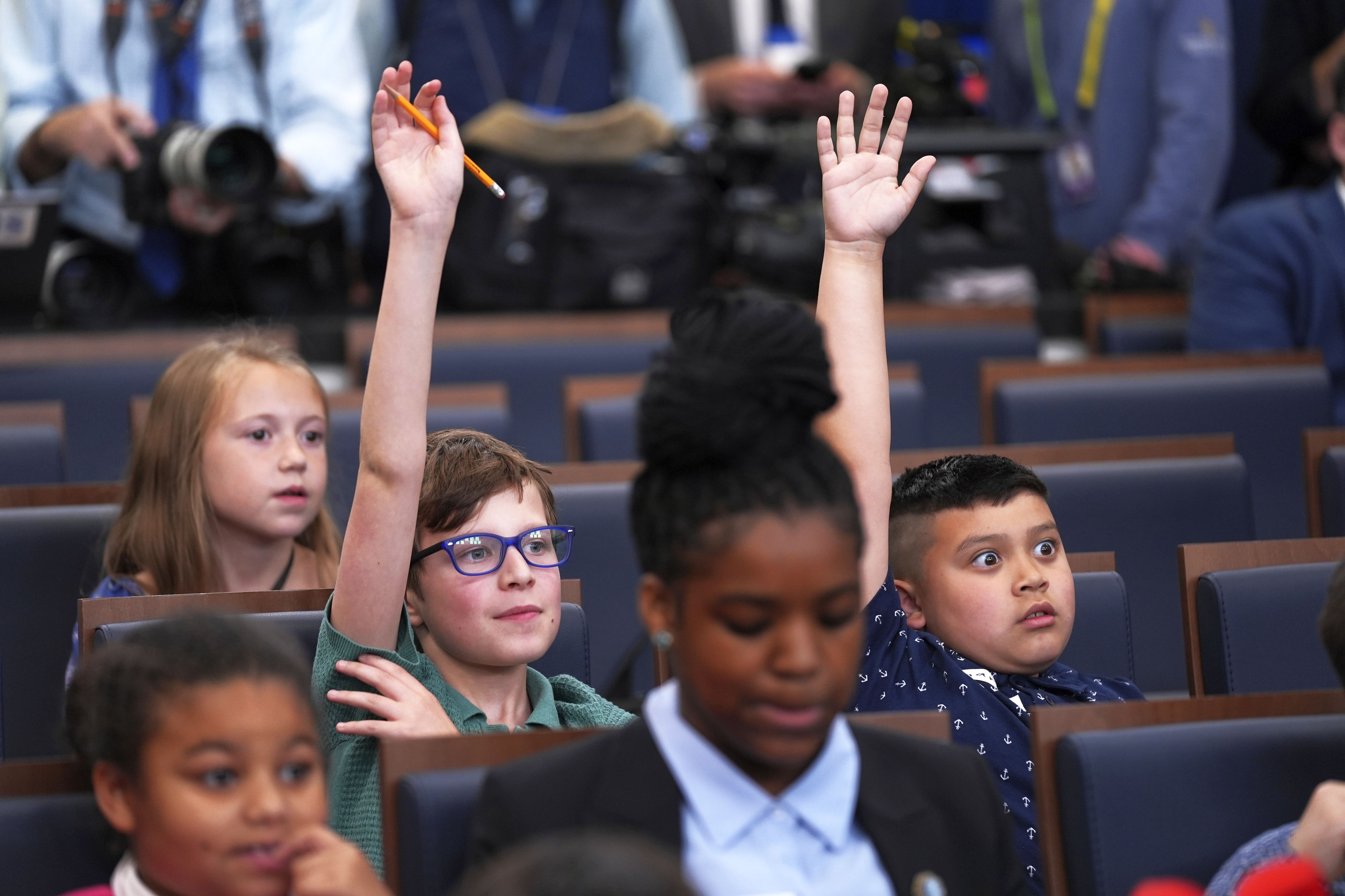 Children raise their hands as White House press secretary Karoline Leavitt speaks during a briefing for “Take Our Sons and Daughters To Work Day” at the White House, Tuesday, May 20, 2025, in Washington. (Photo by Evan Vucci/AP Photo)