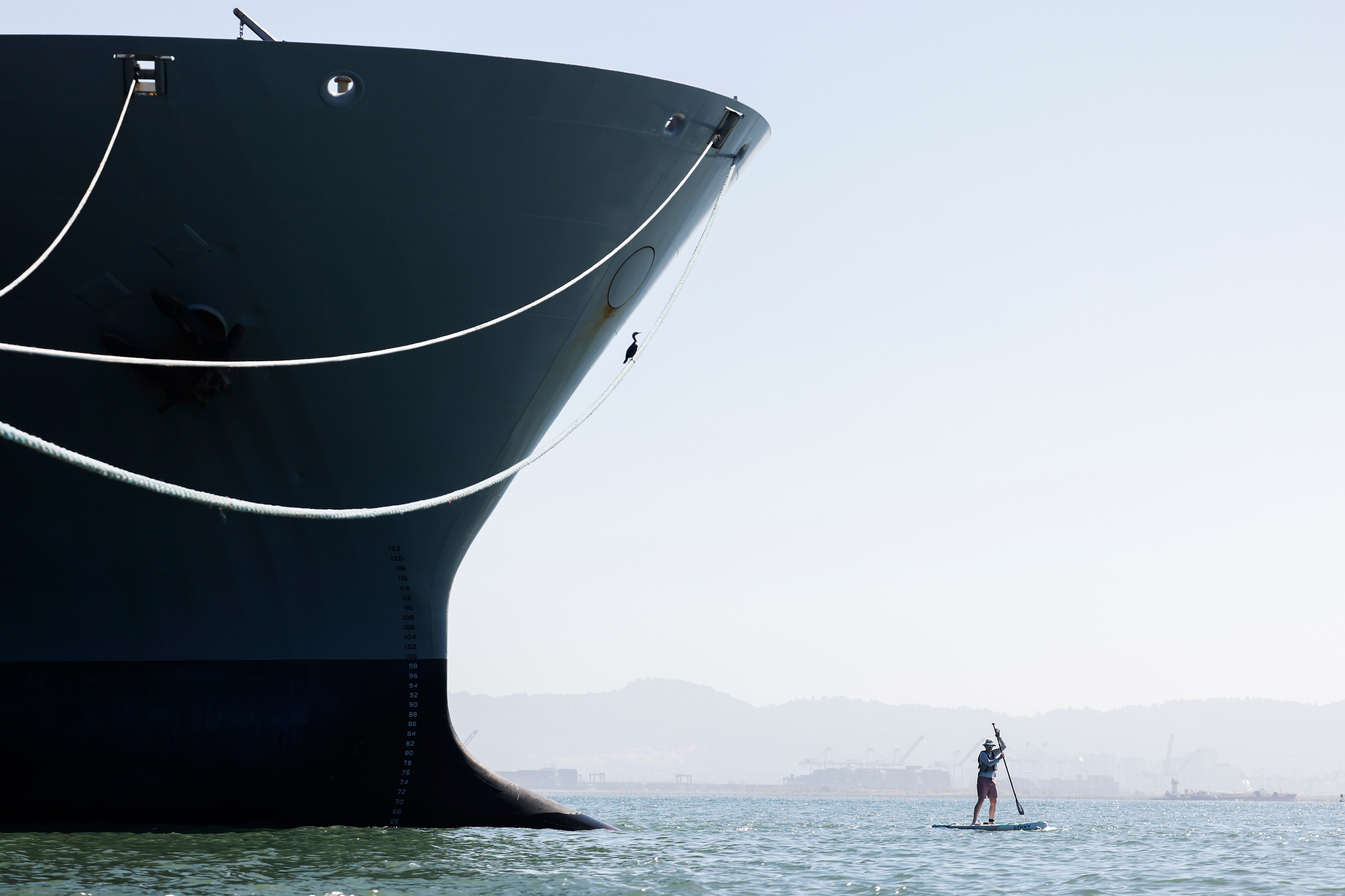 A paddleboarder passes a ship in the waters off Crane Cove Park in San Francisco, US on May 20, 2025. (Photo by Jessica Christian/San Francisco Chronicle via AP Photo)