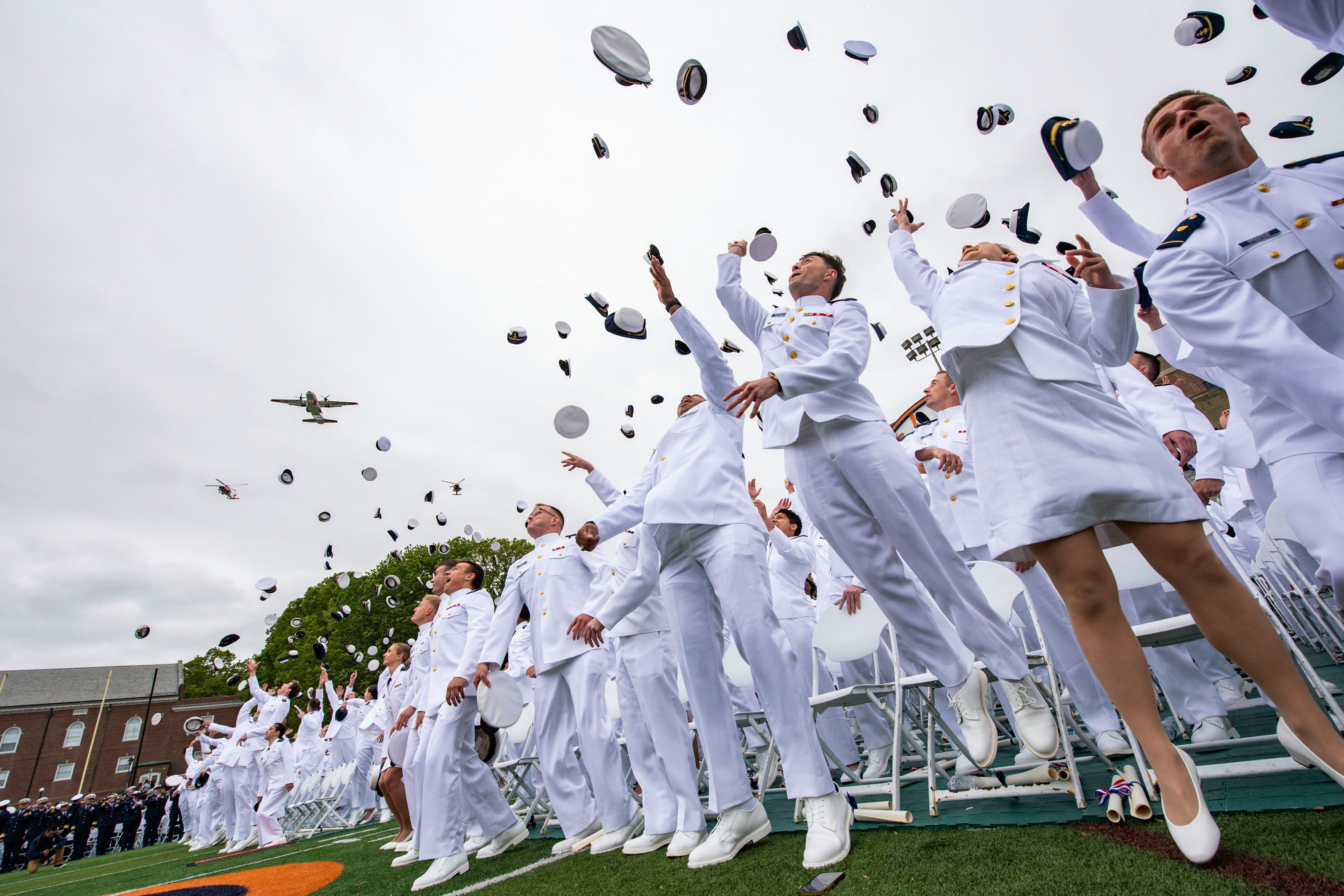 Newly commissioned officers toss their hats during the US Coast Guard Academy's 144th Commencement in New London, Connecticut, on May 21, 2025. (Photo by Joseph Prezioso/AFP Photo)