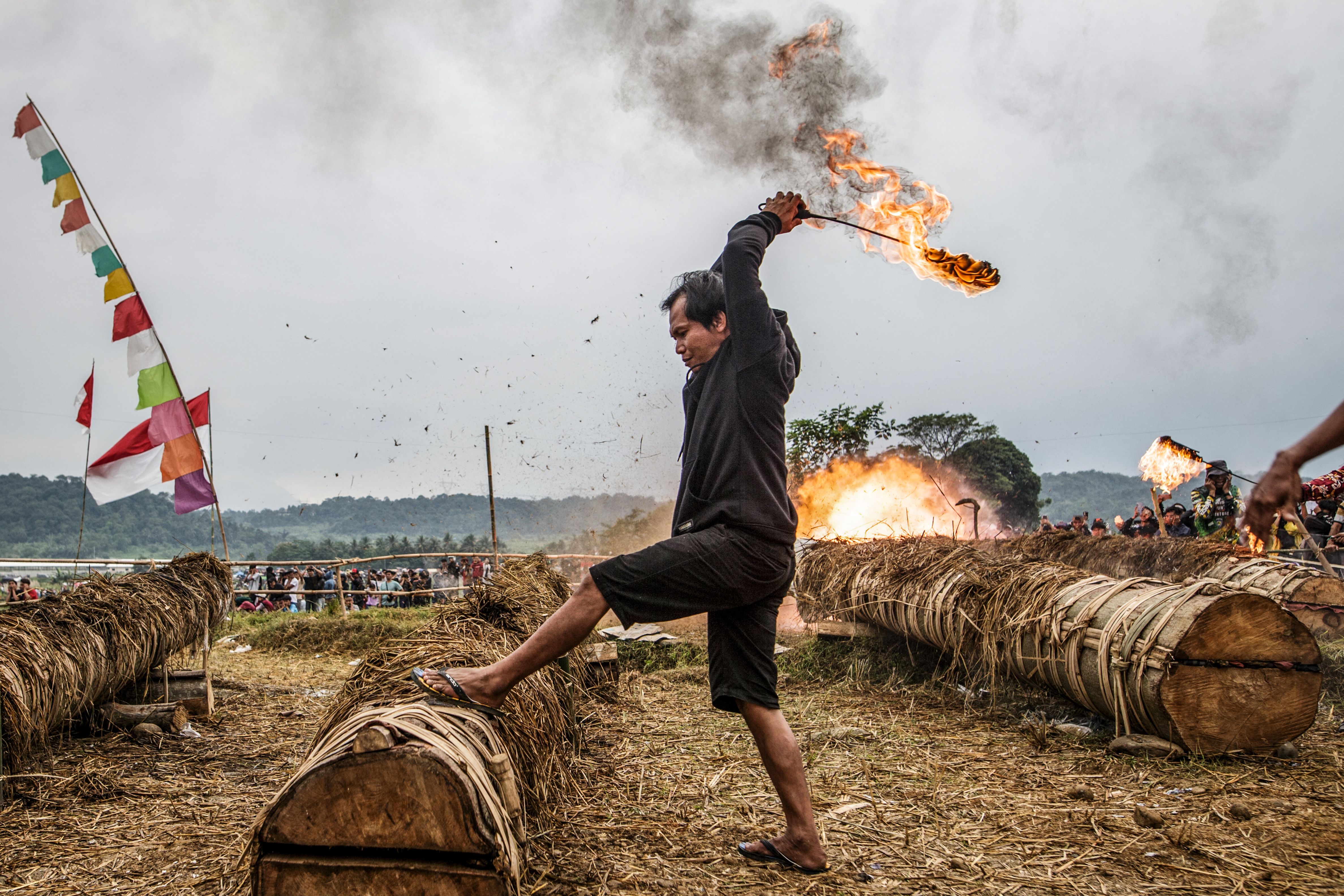 A participant ignites a tree-trunk cannon to create an explosive sound using carbide and water during the Kuluwung Festival, a two-day traditional sound battle held annually between two villages on opposite sides of a river in Sukasirna, West Java, on April 5, 2025. (Photo by Aditya Aji/AFP Photo)
