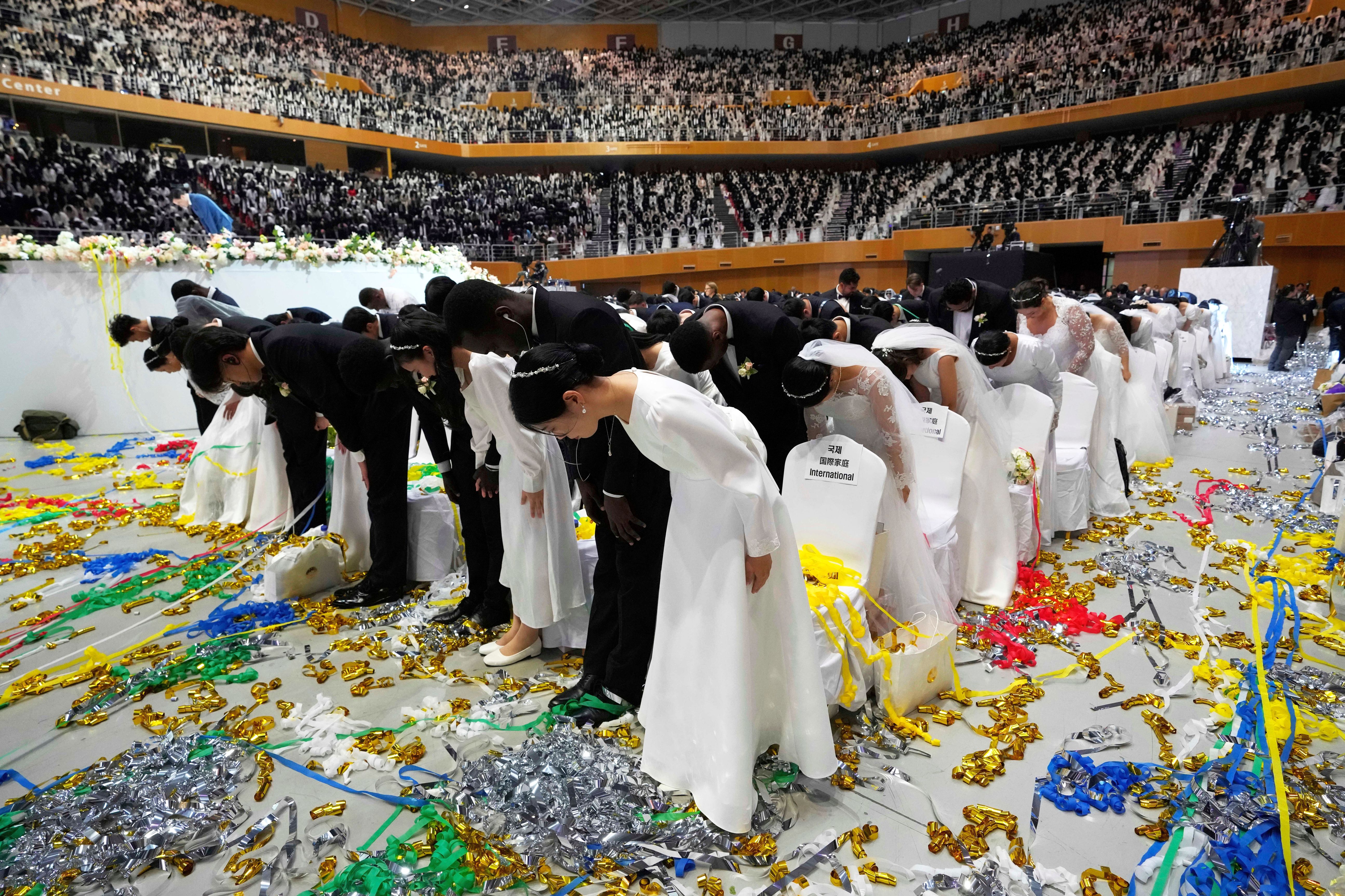 Couples bow during a mass wedding ceremony at the Cheong Shim Peace World Center in Gapyeong, South Korea, Saturday, April 12, 2025. (Photo by Ahn Young-joon/AP Photo)