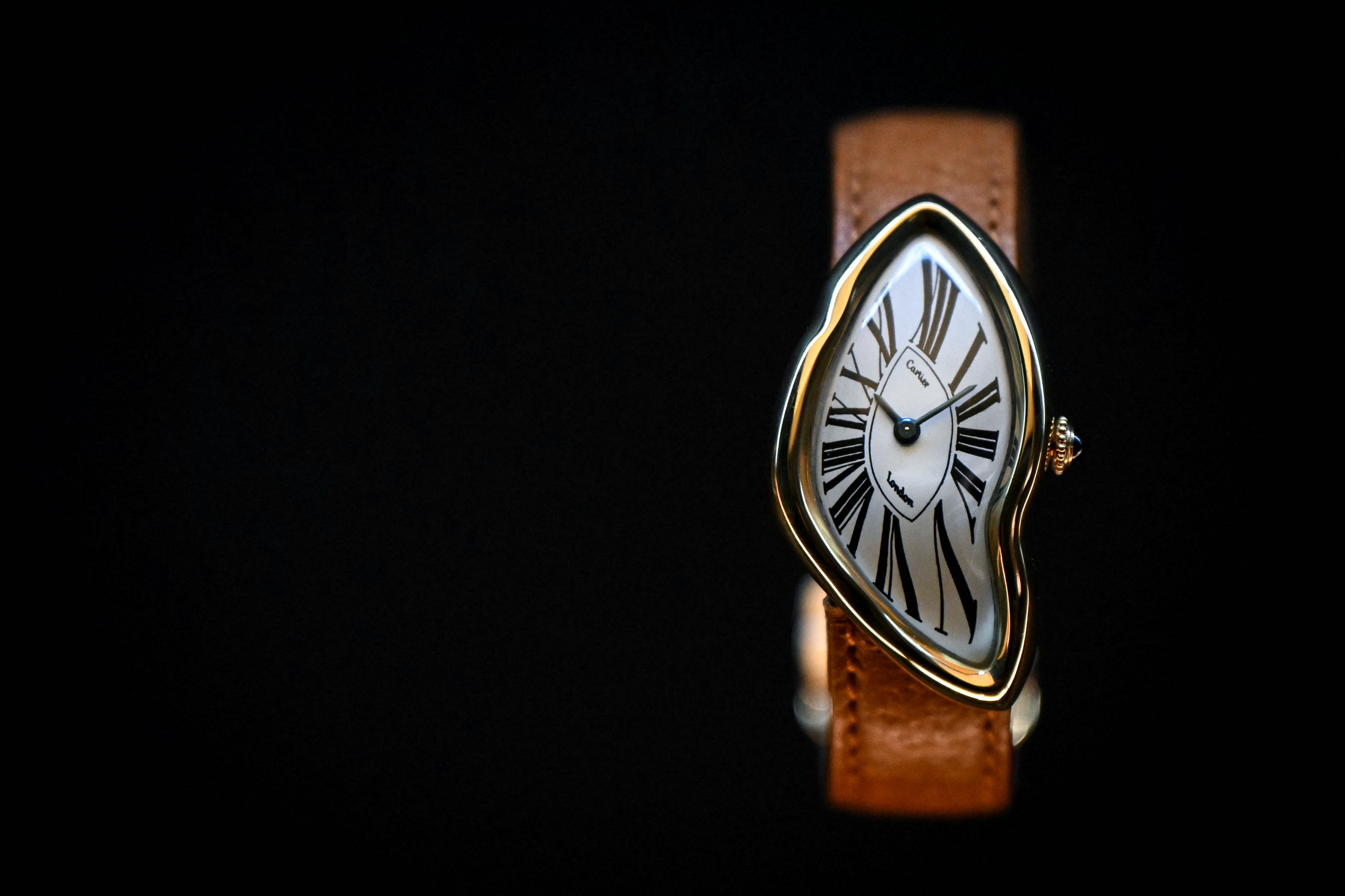 The Crash wristwatch dated from 1967 is pictured during a photocall for the forthcoming Cartier exhibition at the V&A (Victoria and Albert) museum in London, on April 9, 2025. The exhibition features more than 350 objects, and charts the evolution of the Cartier house's legacy of art, design and craftsmanship since the turn of the 20th century. The exhibition is set to open to the public on April 12, 2025. (Photo by Justin Tallis/AFP Photo)
