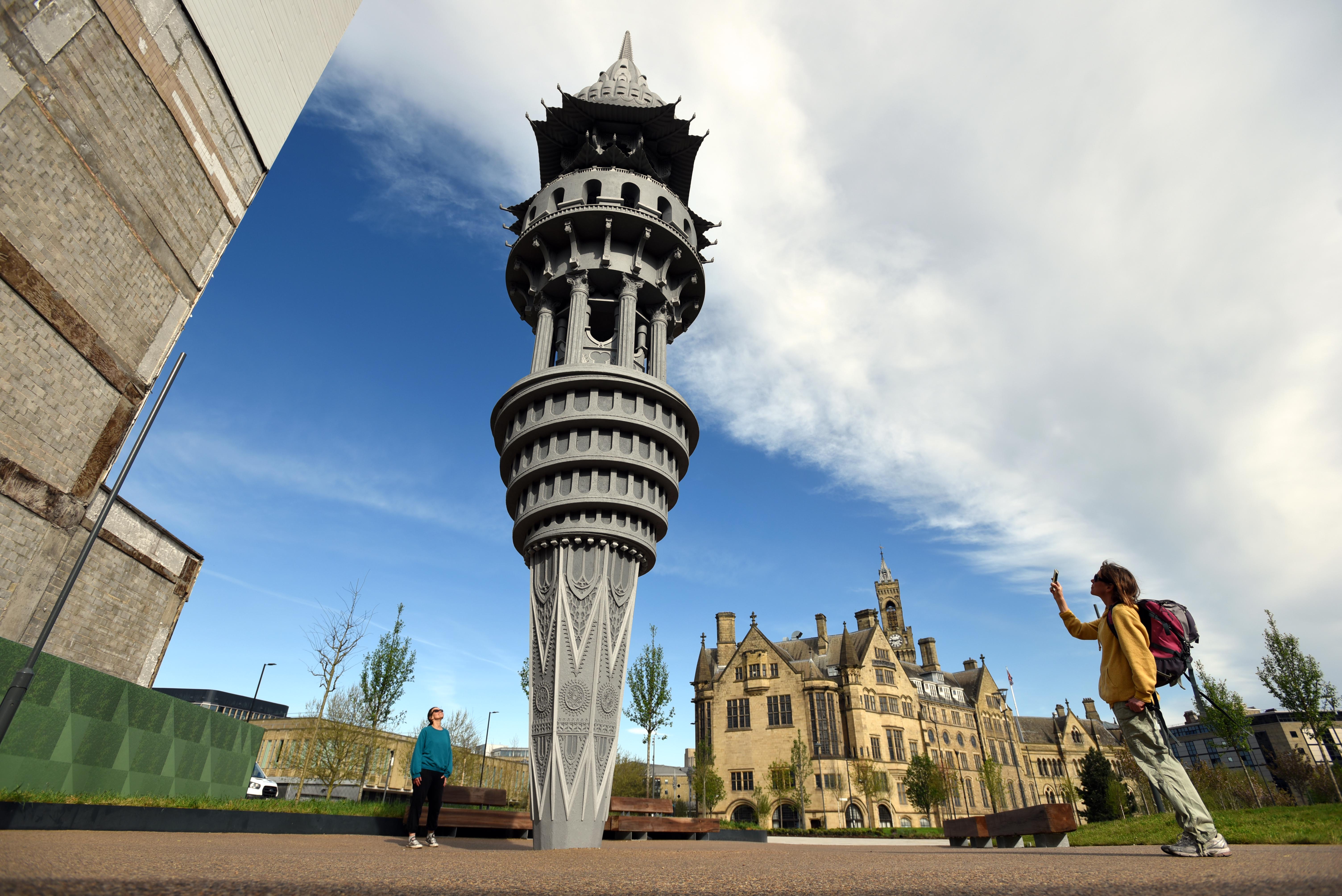 Sculptor Saad Qureshi's 50ft tall sculpture Tower of Now, which was unveiled on Saturday 26 April 2025 on the perimeter of the newly-opened 2.5 acre Norfolk Gardens park in Bradford city centre, UK. The carved wooden structure, commissioned for Bradford's 2025 City of Culture year, brings together architectural elements from Bradford's diverse religious buildings in what the artist describes as a homage to the communities that make up the city and nurtured his creativity. Qureshi grew up in Bradford after moving with his parents from Pakistan at the age of eight. (Photo by Guzelian)