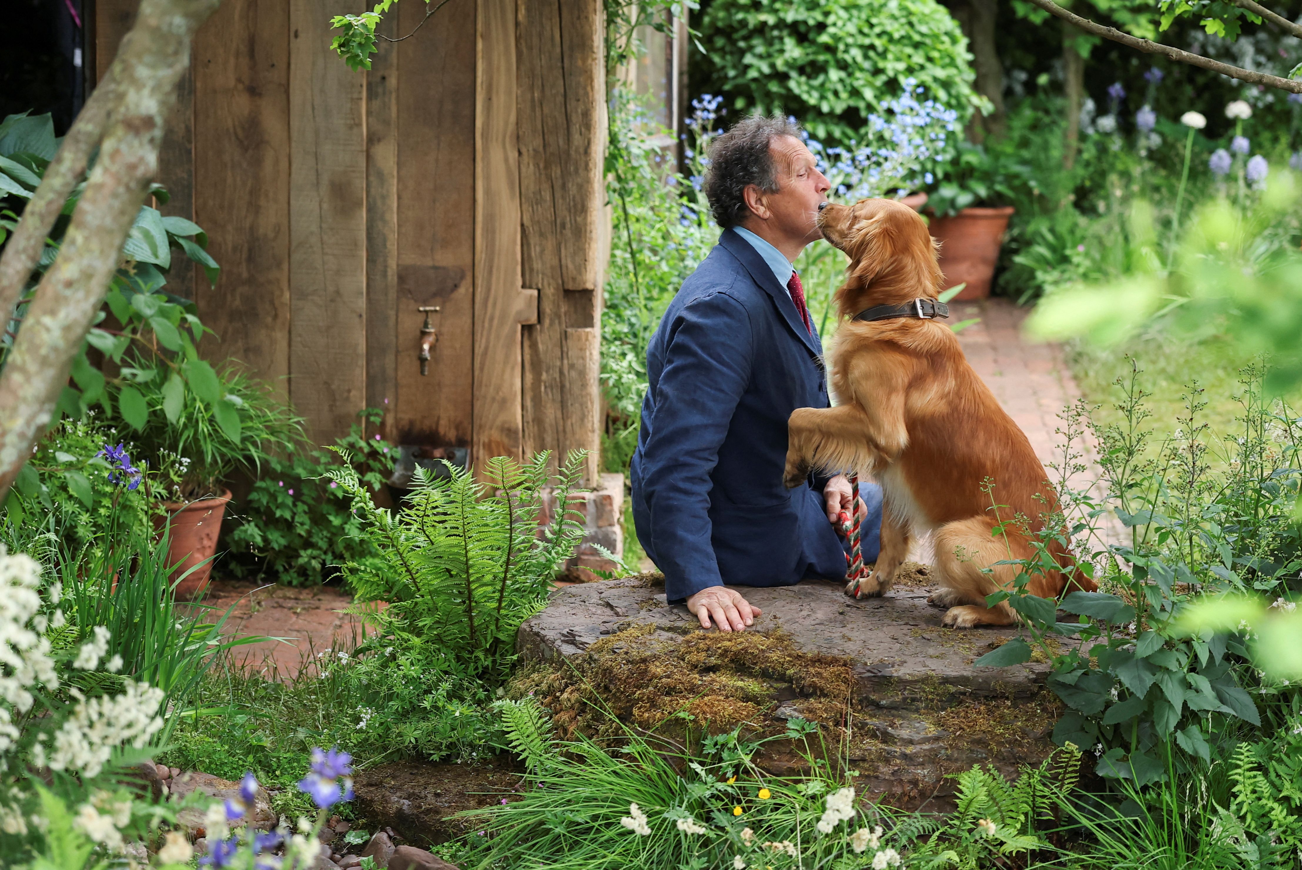 Gardening expert Monty Don plays with his dog, Ned, at the RHS and BBC Radio 2 Dog Garden at the Chelsea Flower Show in London, Britain, on May 19, 2025. (Photo by Toby Melville/Reuters)