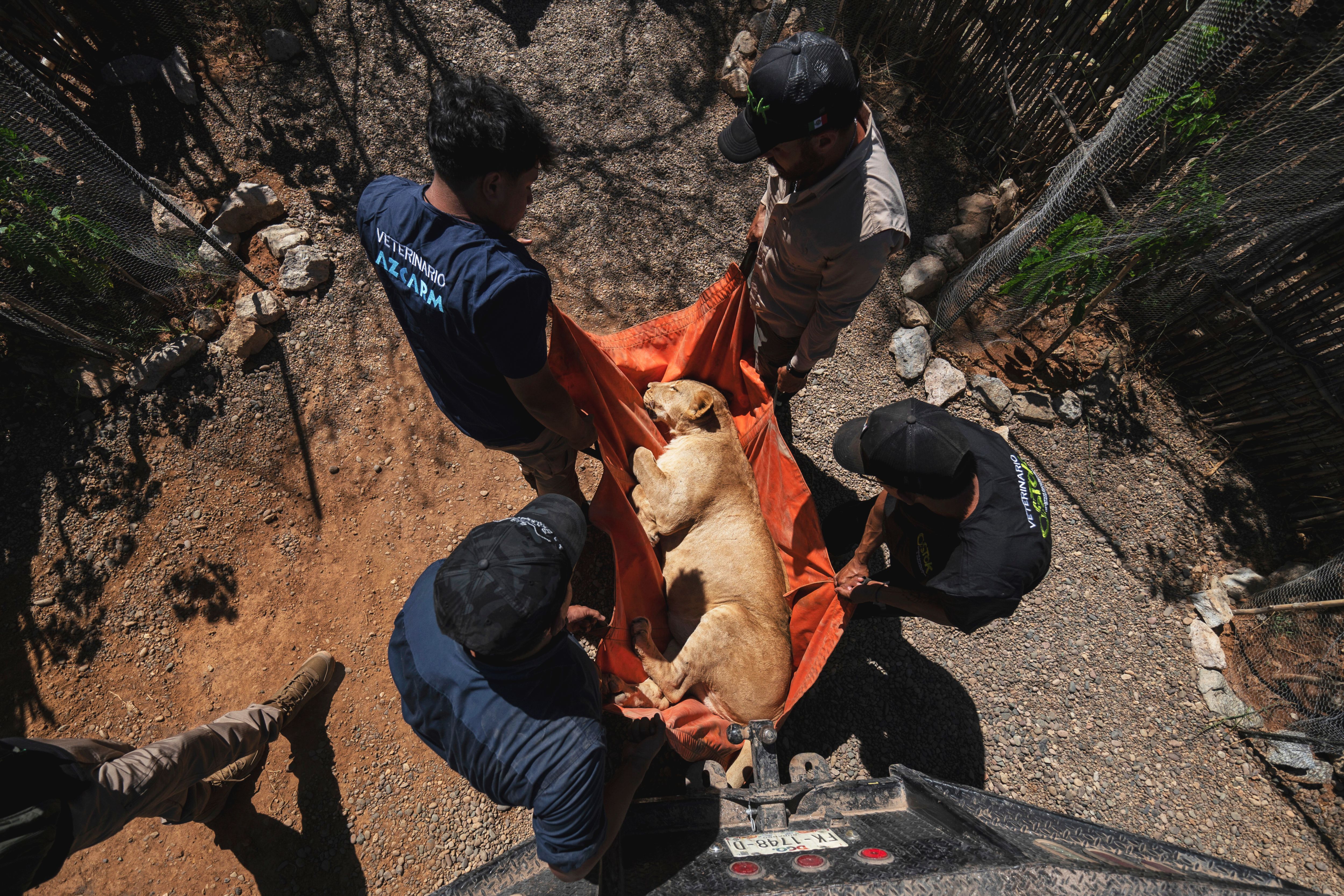 A lioness is carried to a transport cage at the animal refuge Ostok Sanctuary, on the outskirts of Culiacan, Mexico, Monday, May 19, 2025. (Photo by Felix Marquez/AP Photo)