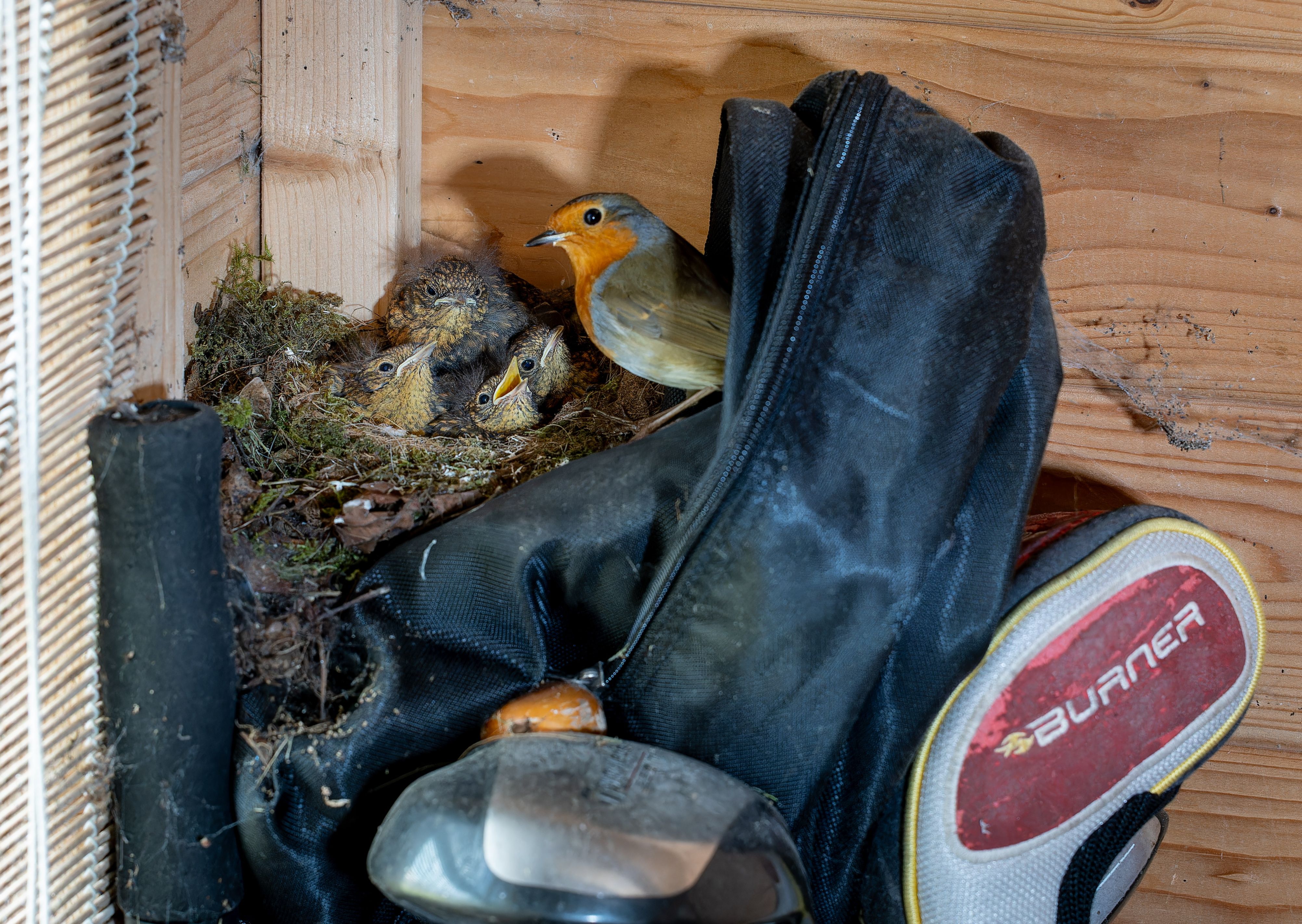 A family of robins nesting on a golf bag in Michael Oliver's garden shed in Chester le Street, Durham, UK. (Photo by Michael Oliver/Animal News Agency)
