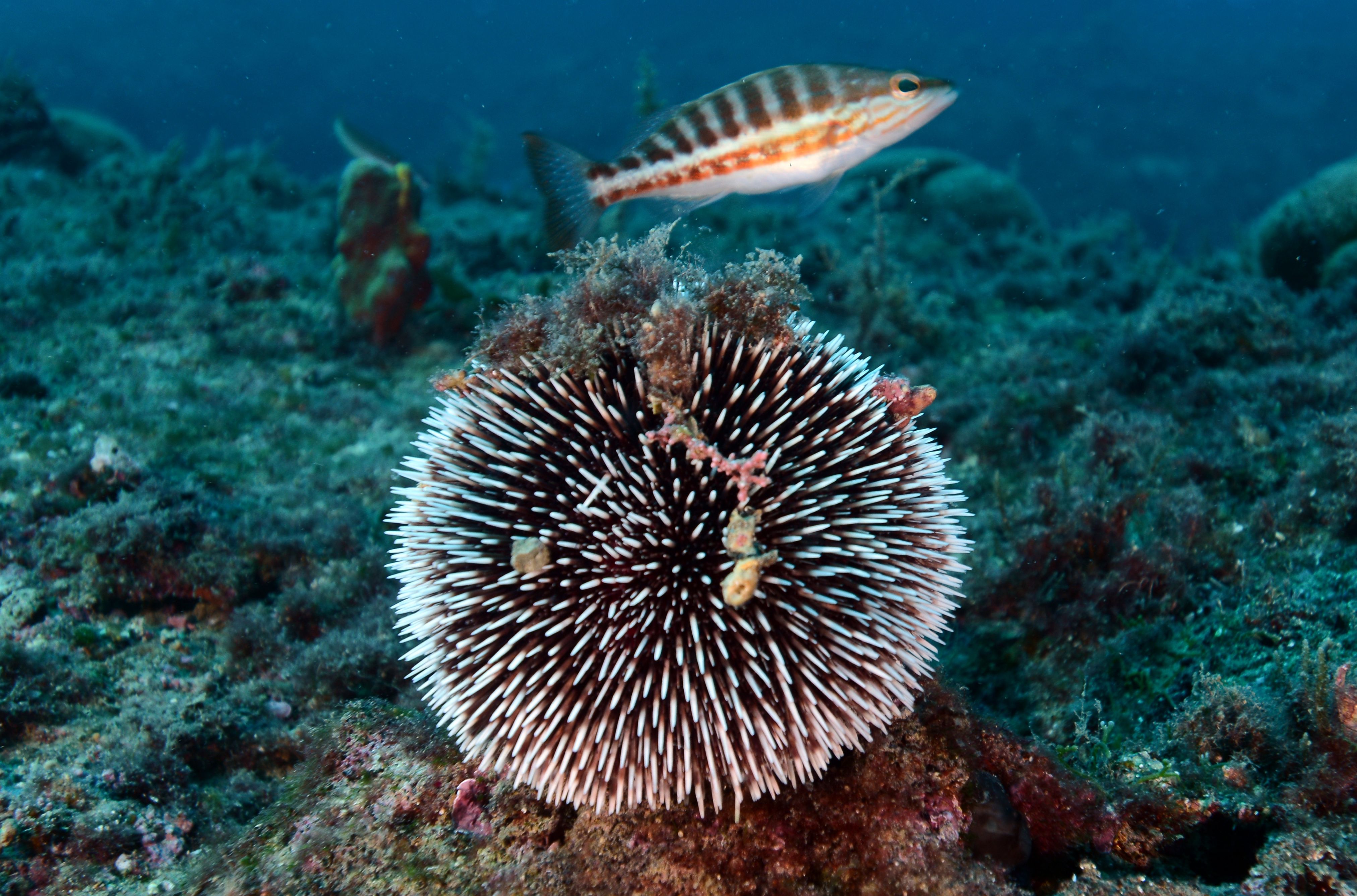 A sea urchin (Tripneustes ventricosus) is seen underwater at Asi Bay, located between Iztuzu and Sarigerme in Ortaca district of Mugla, Turkiye on April 22, 2024. Asi Bay is known for its underwater diversity and underwater caves, making it a main attraction for divers and underwater photographers. (Photo by Tahsin Ceylan/Anadolu via Getty Images)