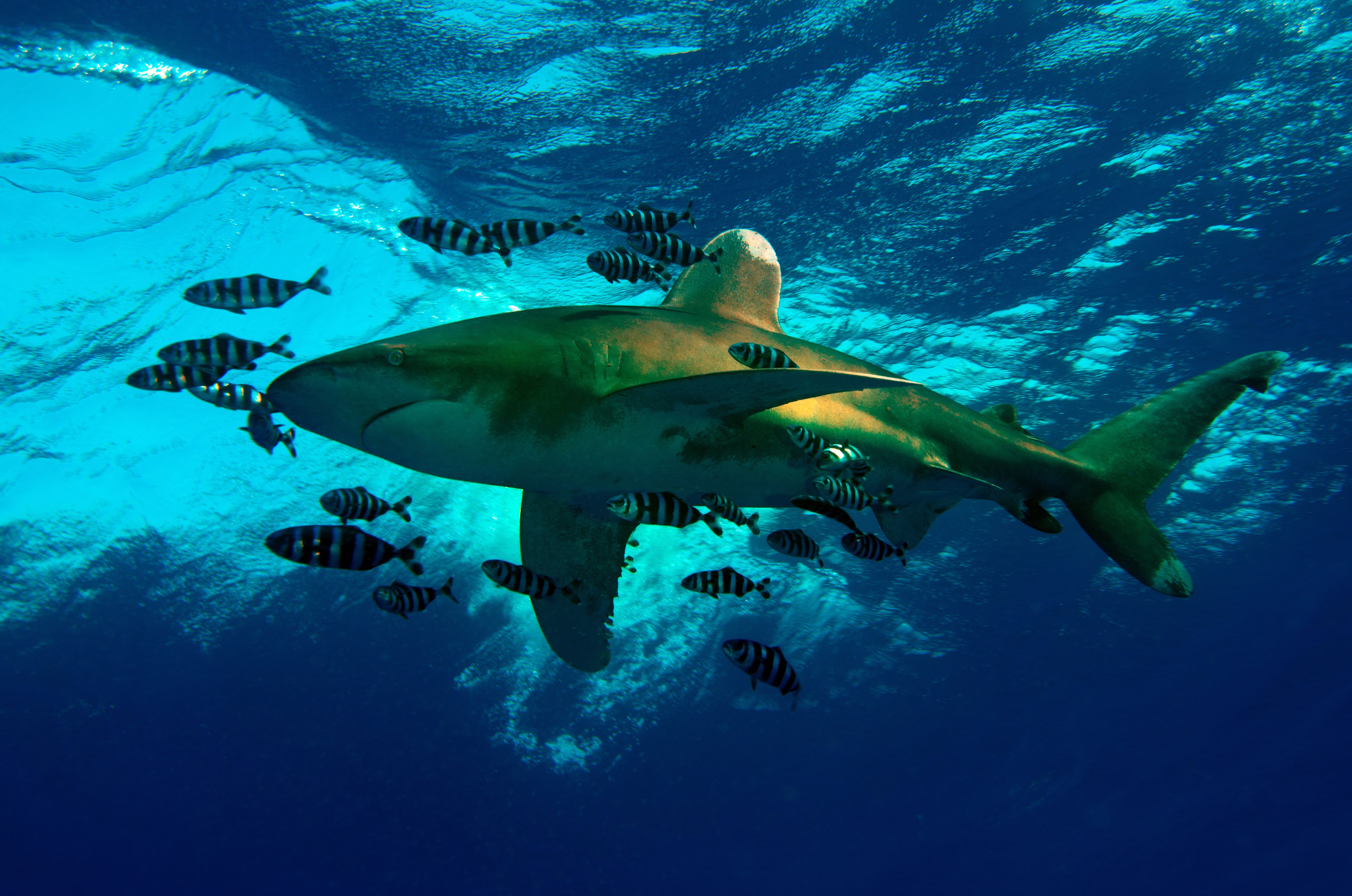 An oceanic whitetip shark (Carcharhinus longimanus) is seen swimming in Egypt's Red Sea, one of the most important places in the world for underwater richness and home to many species on December 22, 2024. The Red Sea, which is an extension of the Indian Ocean and located between the Arabian Peninsula and the African continent, offers both the scientific world and divers the opportunity to dive in its clear waters with its strategic and historical importance as well as its unique living diversity. (Photo by Tahsin Ceylan/Anadolu via Getty Images)