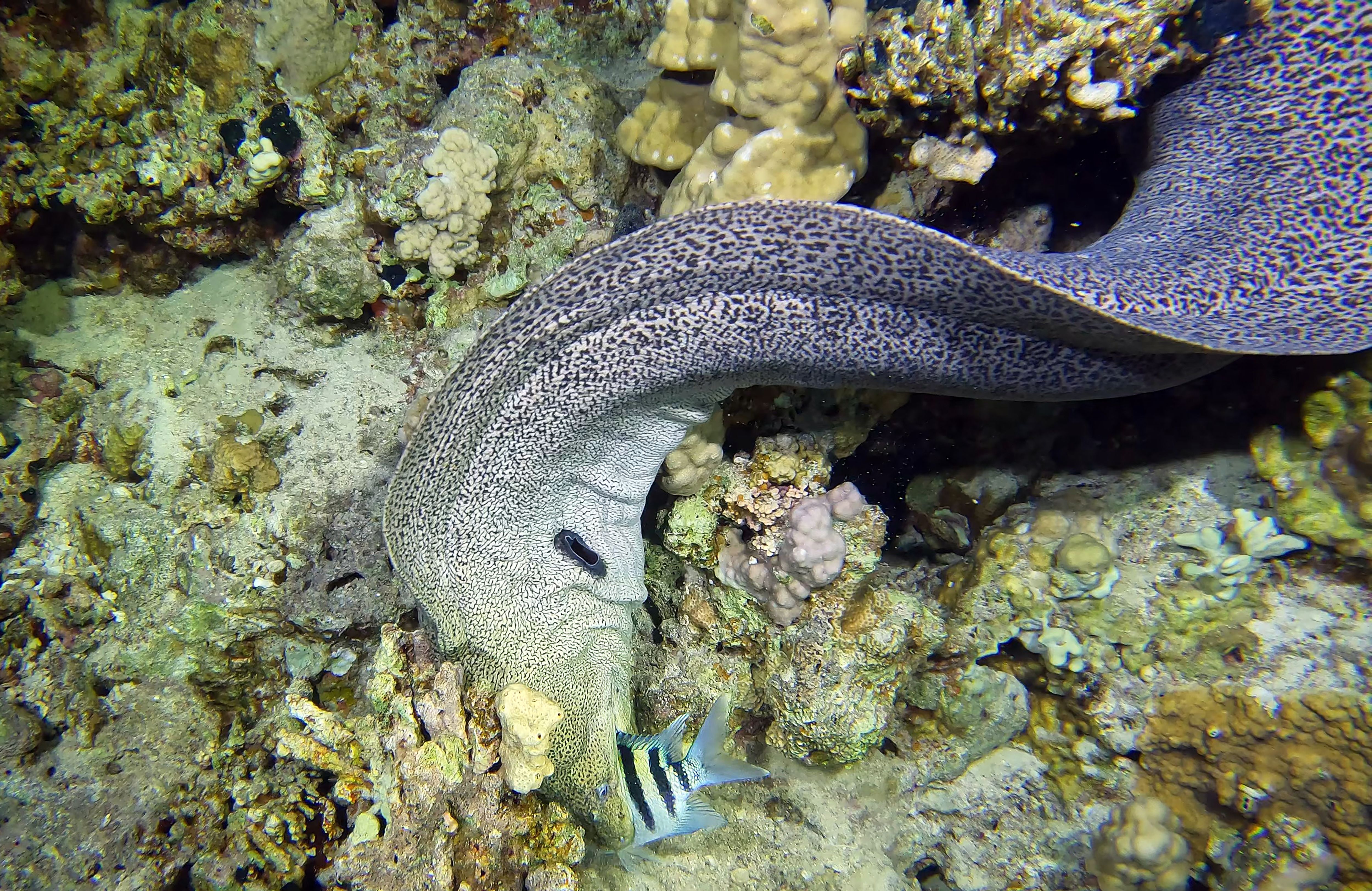 Moray eel is seen in the colorful underwater world of the Red Sea between Africa and Asia in Egypt on January 06, 2025. Due to night diving, which has a special importance in diving literature and requires expertise, many fish and living species that cannot be seen during day dives can be recorded. (Photo by Tahsin Ceylan/Anadolu via Getty Images)