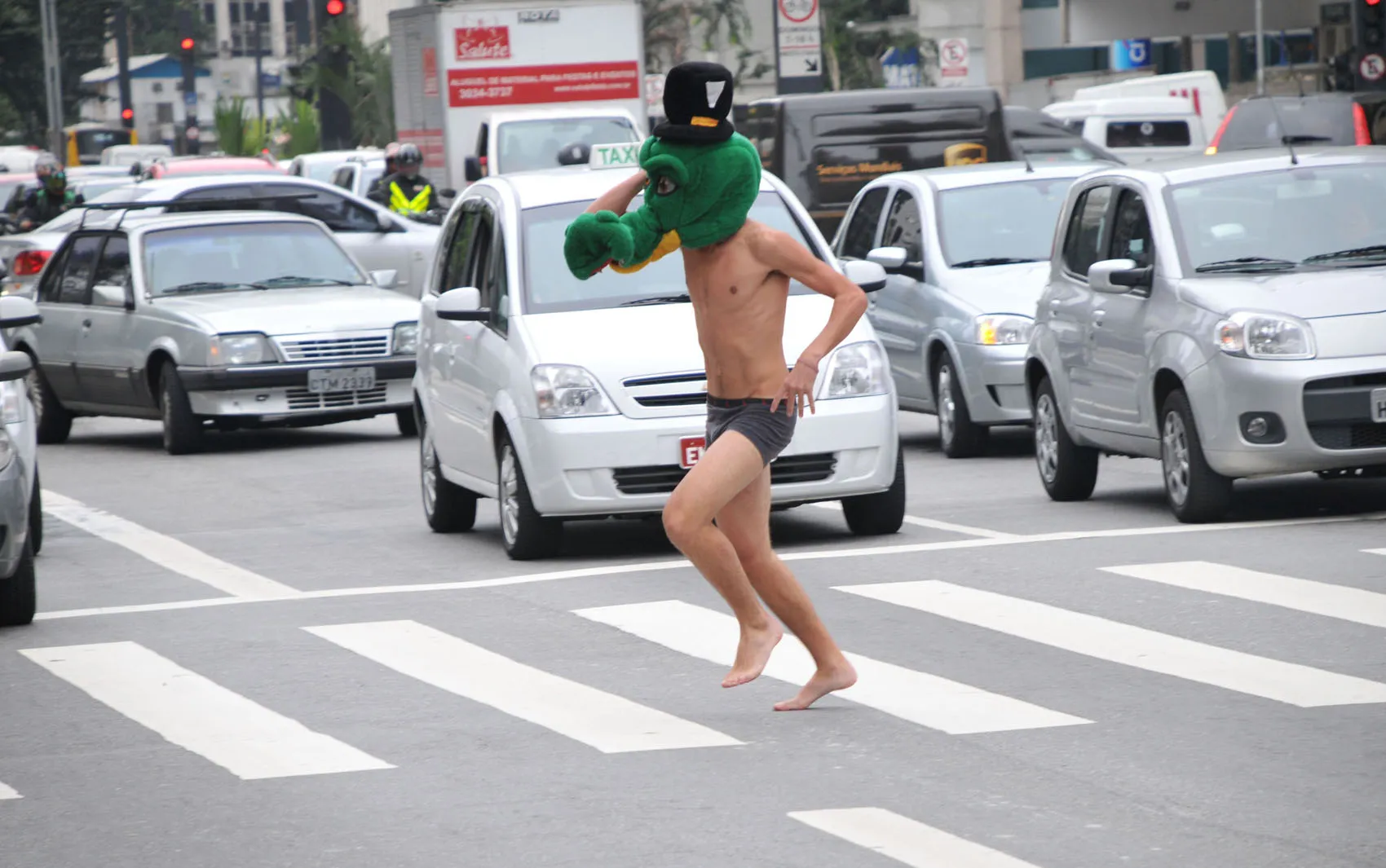 A boy crosses Avenida Paulista, São Paulo, only in underwear and a mask of crocodile head, on March 20, 2013. (Photo by J. Duran Machfee/Futura Press/Estadão Conteúdo)