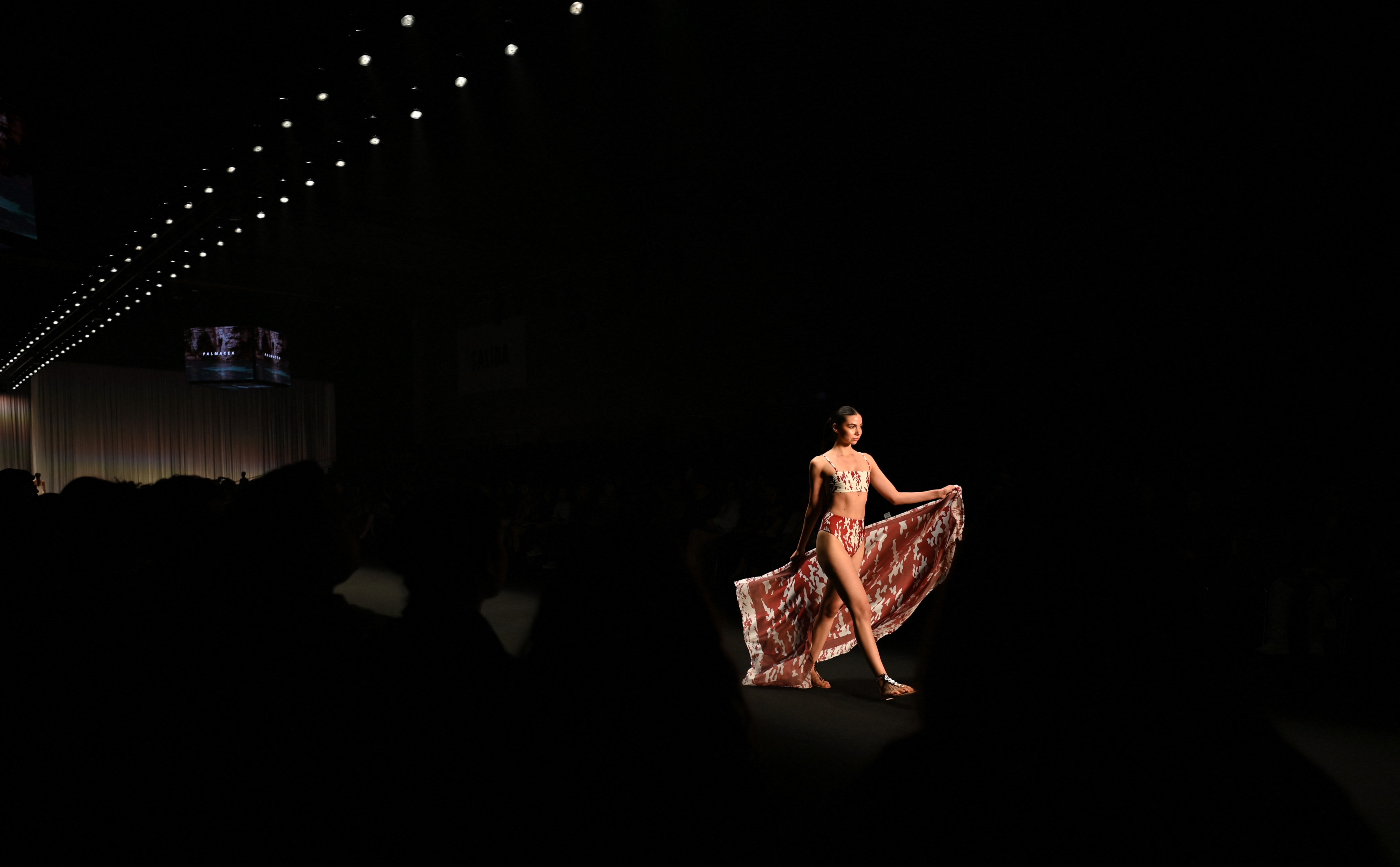 A model presents a creation by Palmacea brand during Bogota Fashion Week in Bogota on May 22, 2025. (Photo by Luis Acosta/AFP Photo)