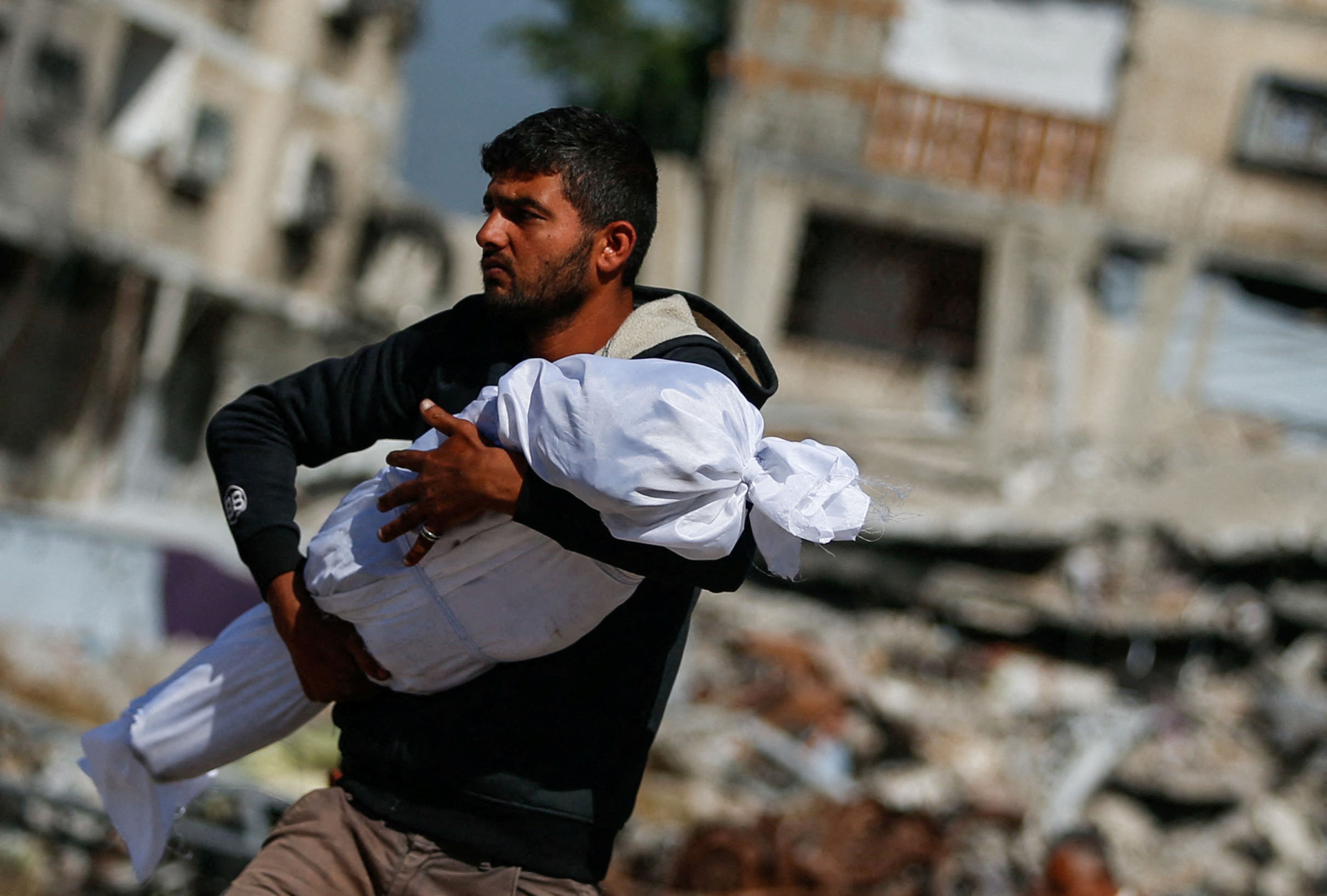 A Palestinian man carries the body of a child killed in Israeli strikes, in Jabalia, in the northern Gaza Strip on May 16, 2025. (Photo by Mahmoud Issa/Reuters)