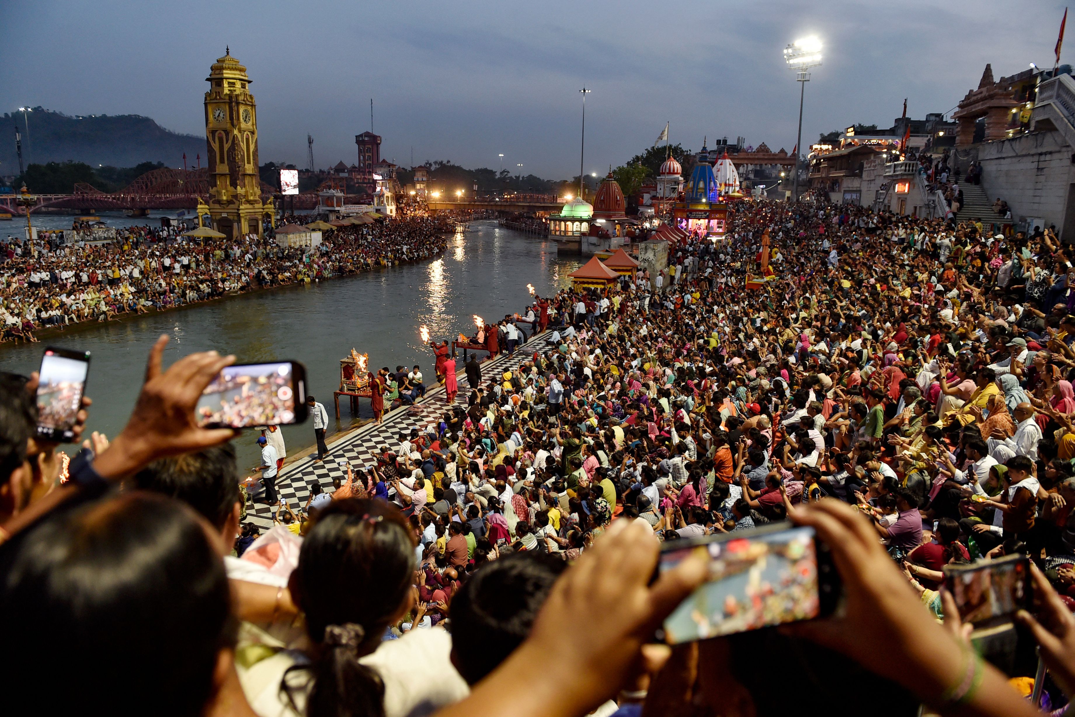 Hindu devotees attend aarti, a ritual that involves lit lamps to seek blessings, during evening prayers at the Har Ki Pauri ghat along the banks of river Ganges in Haridwar on April 26, 2025. (Photo by Shammi Mehra/AFP Photo)
