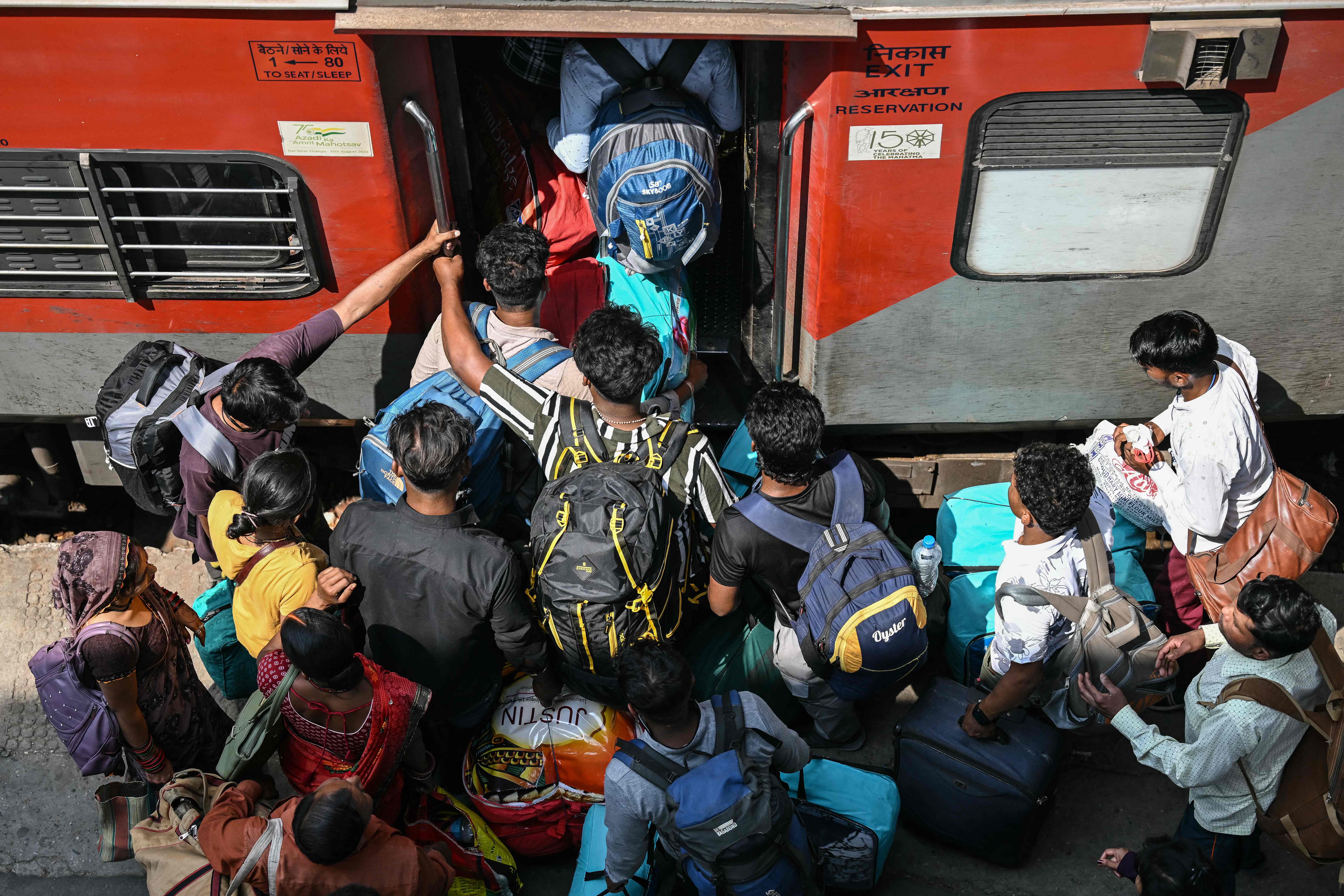 Migrants try to board an overcrowded train as they leave the city at the Jammu Tawi railway station in Jammu on May 10, 2025, amid the ongoing border tensions between India and Pakistan after the Kashmir tourist attack. Pakistan and India on May 10 stepped up missile, drone and artillery attacks in a fourth straight day of conflict, as the US urged both sides to restore dialogue to “avoid miscalculation”. (Photo by Money Sharma/AFP Photo)