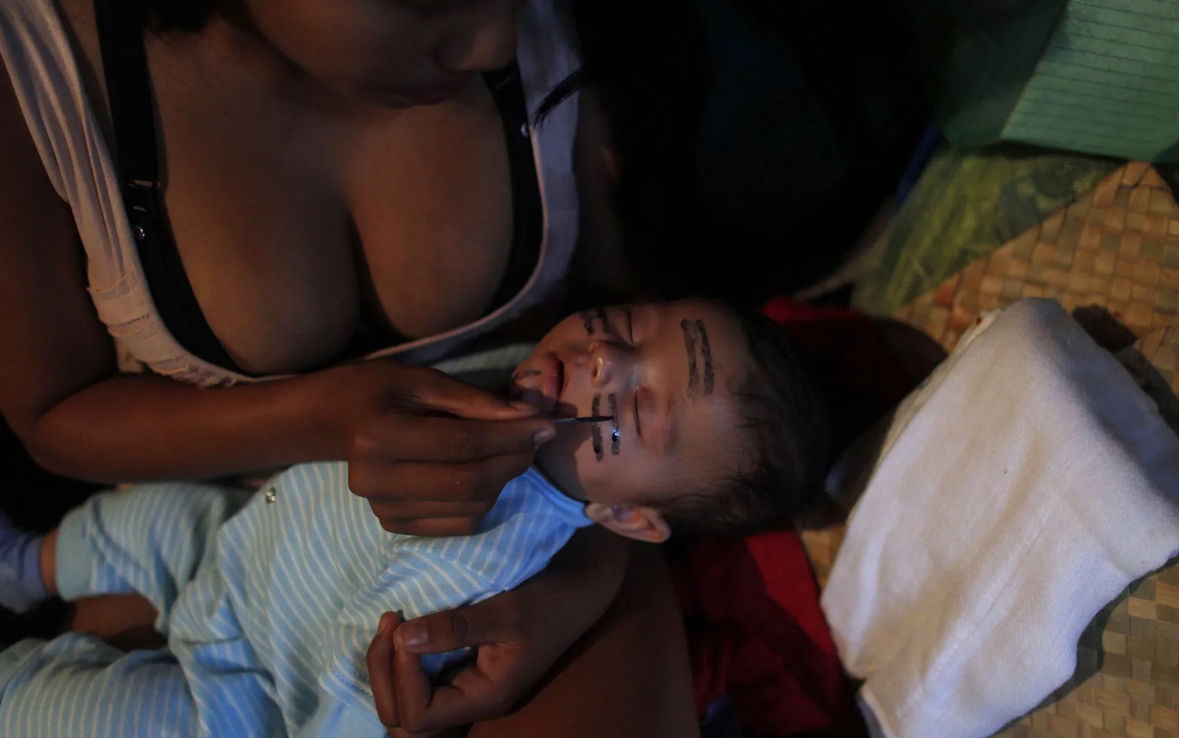 A woman from Indian Tribe Guajajara paints the face of his son in Maracana Village, former Indian Museum in Rio, on March 18, 2013. (Photo by Pilar Olivares/Reuters)