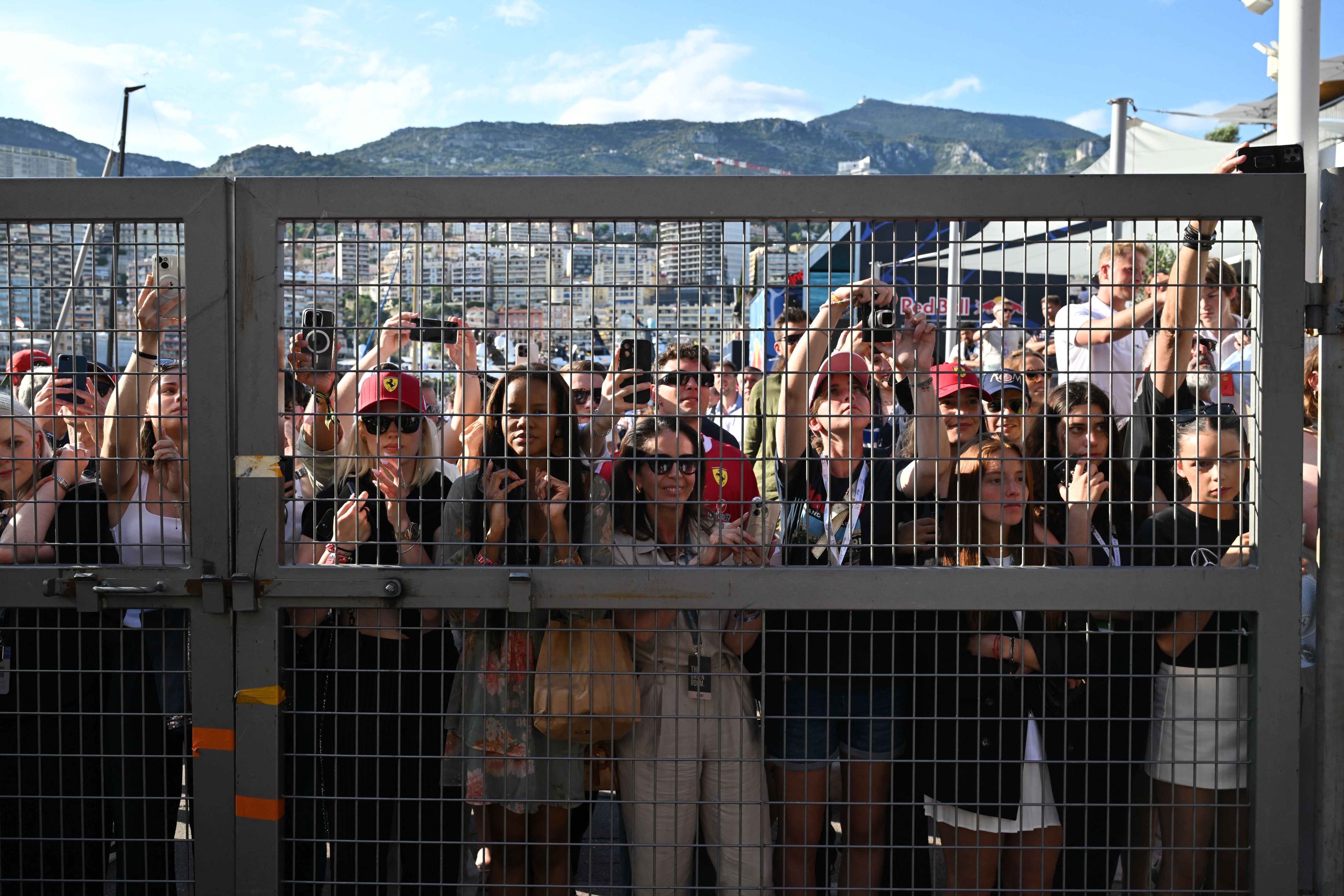 Fans stretch to look into the pit lane at the end of the qualifying session for the Formula One Monaco Grand Prix at the Circuit de Monaco, on May 24, 2025. (Photo by Andrej Isaković/AFP Photo)
