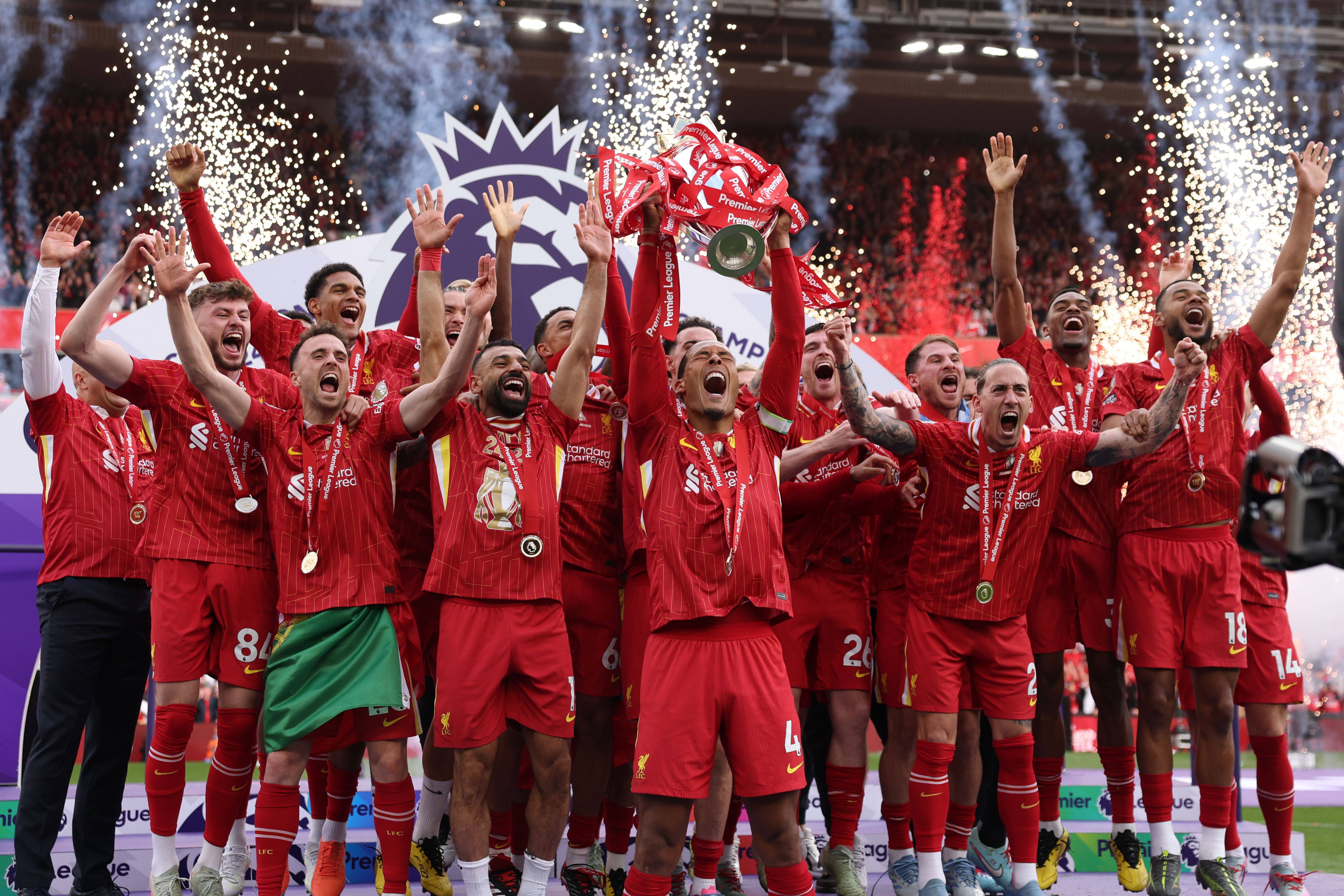 Virgil van Dijk of Liverpool, lifts the Premier League trophy after his team's victory in the Premier League match between Liverpool FC and Crystal Palace FC at Anfield on May 25, 2025 in Liverpool, England. (Photo by Carl Recine/Getty Images)