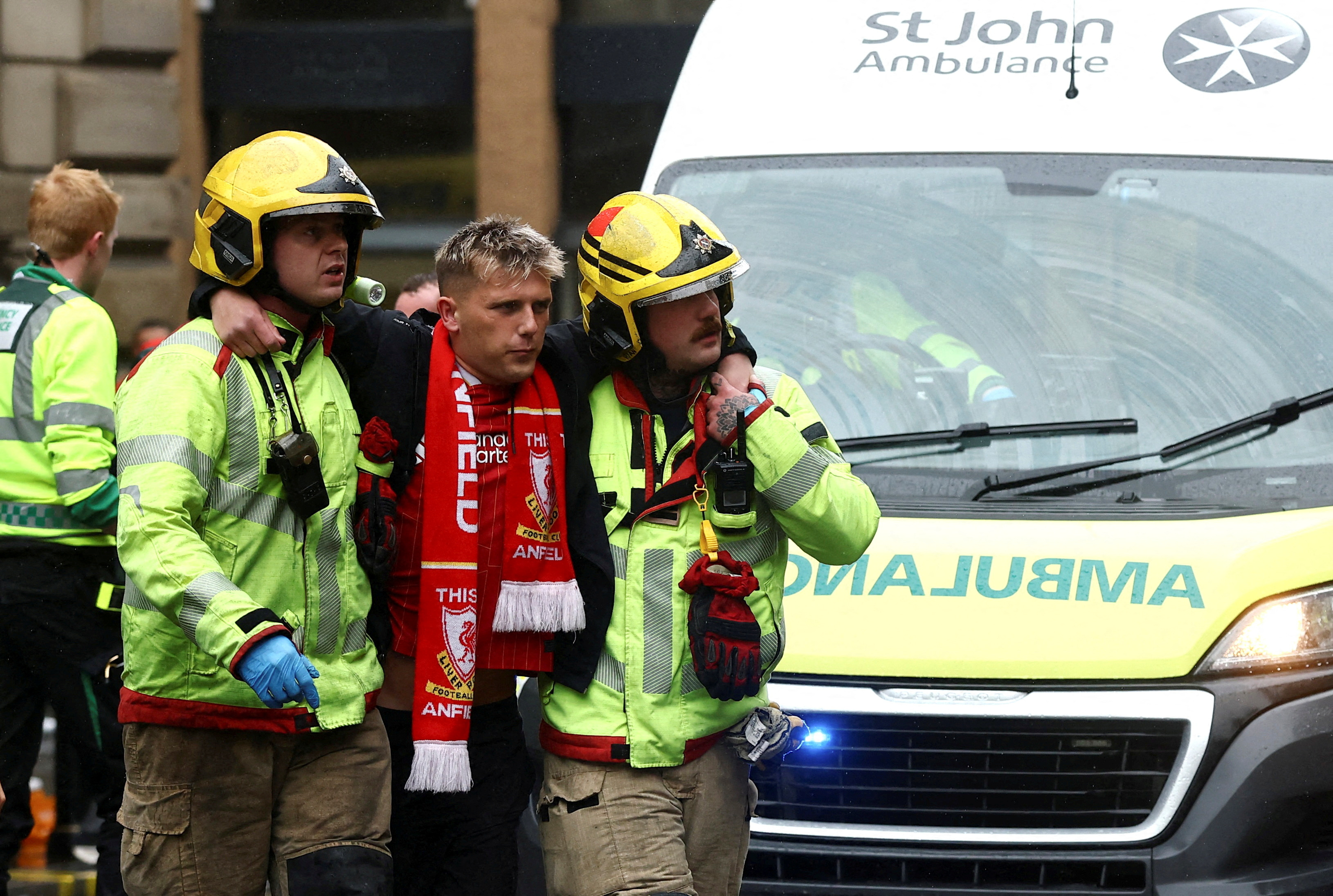 A fan is assisted by fire fighters at an incident after a car ploughed into a crowd of Liverpool fans during a Premier League title parade in Liverpool, Britain on May 26, 2025. (Photo by Lee Smith/Action Images via Reuters)