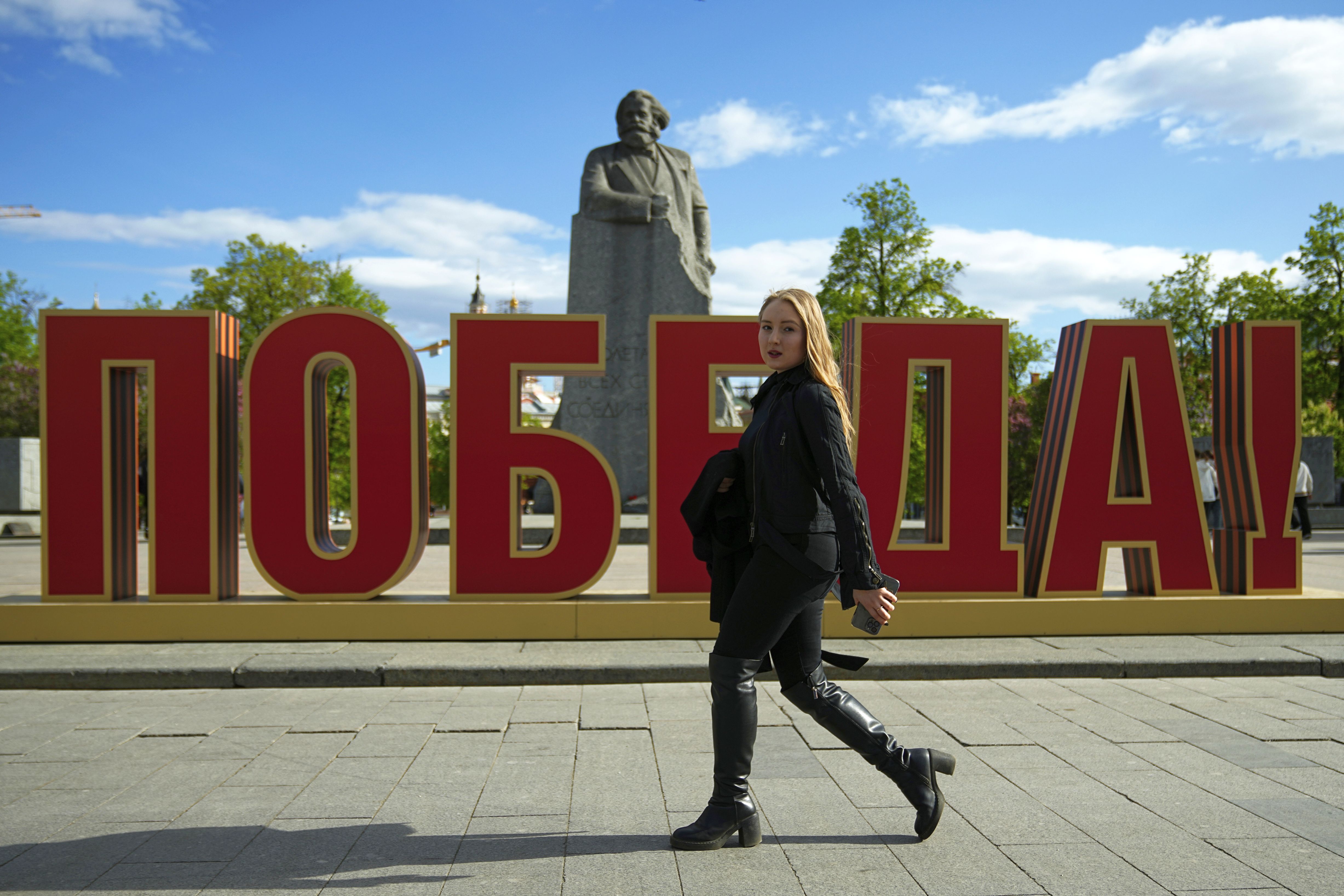 A woman walks next to an installation reading “Victory” In Russian, installed next to the monument of Karl Marx ahead of celebrations of the 80th anniversary of the Soviet Union's victory over Nazi Germany during World War II, in Moscow, Russia, Monday, April 28, 2025. (Photo by Pavel Bednyakov/AP Photo)