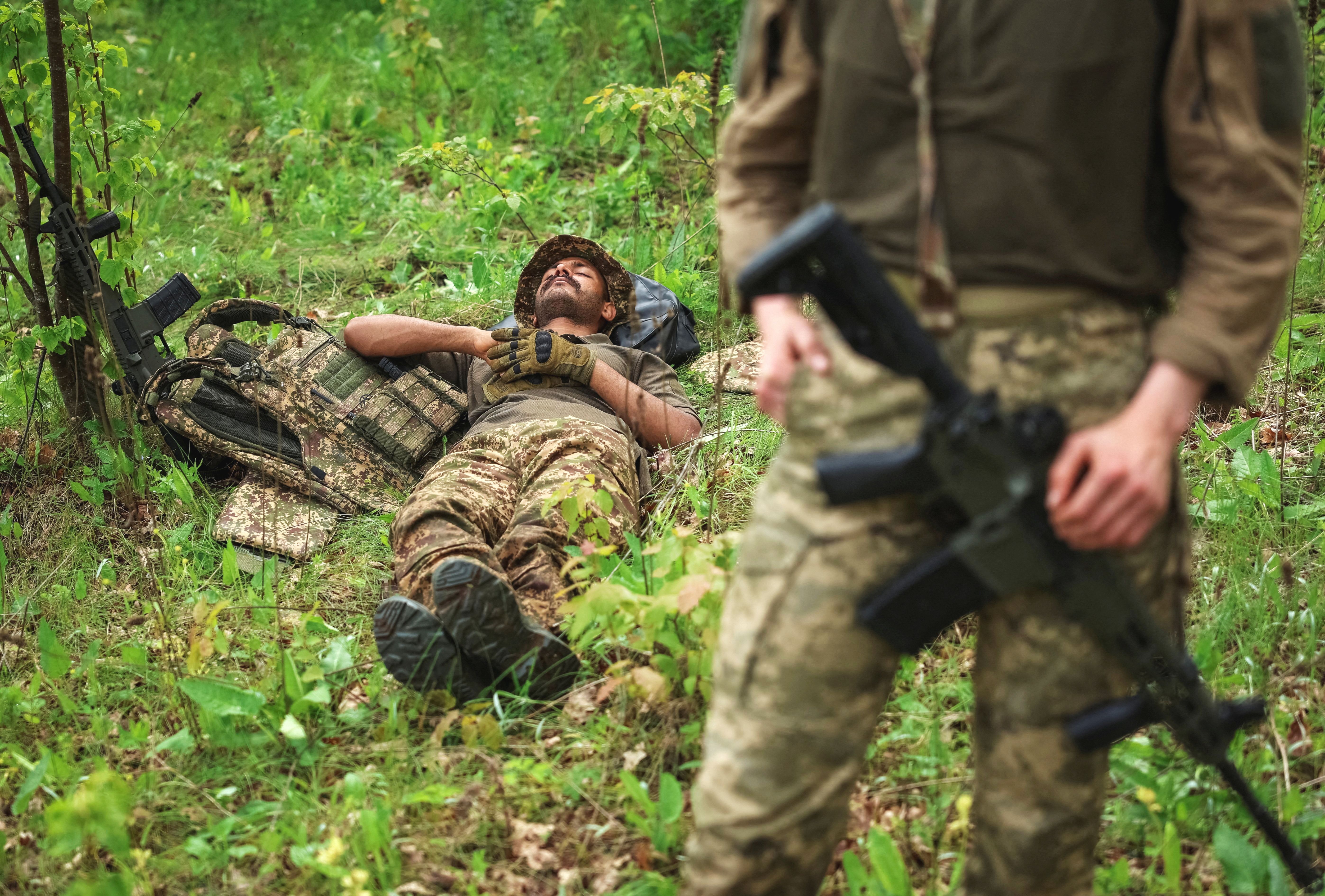 A foreign service member of 13th Operative Purpose Brigade “Khartiia” of the National Guard of Ukraine rests as he takes part in an exercise, in Kharkiv region, Ukraine on May 20, 2025. (Photo by Anatolii Stepanov/Reuters)