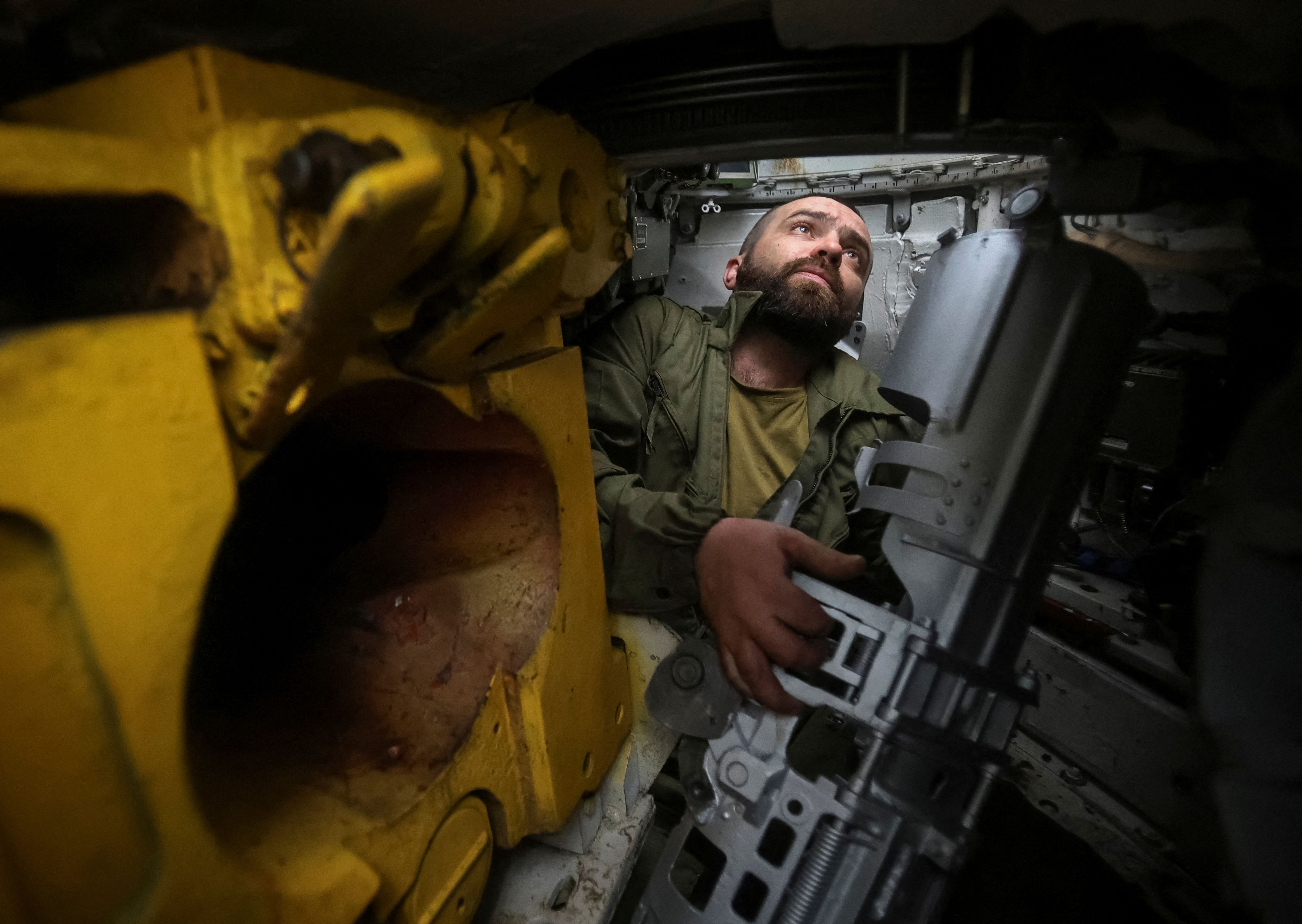A serviceman of Ukraine's 49th Separate Assault Battalion Carpathian Sich repairs a T-80 tank captured earlier from Russian troops, in Donetsk region, Ukraine on April 14, 2025. (Photo by Anatolii Stepanov/Reuters)