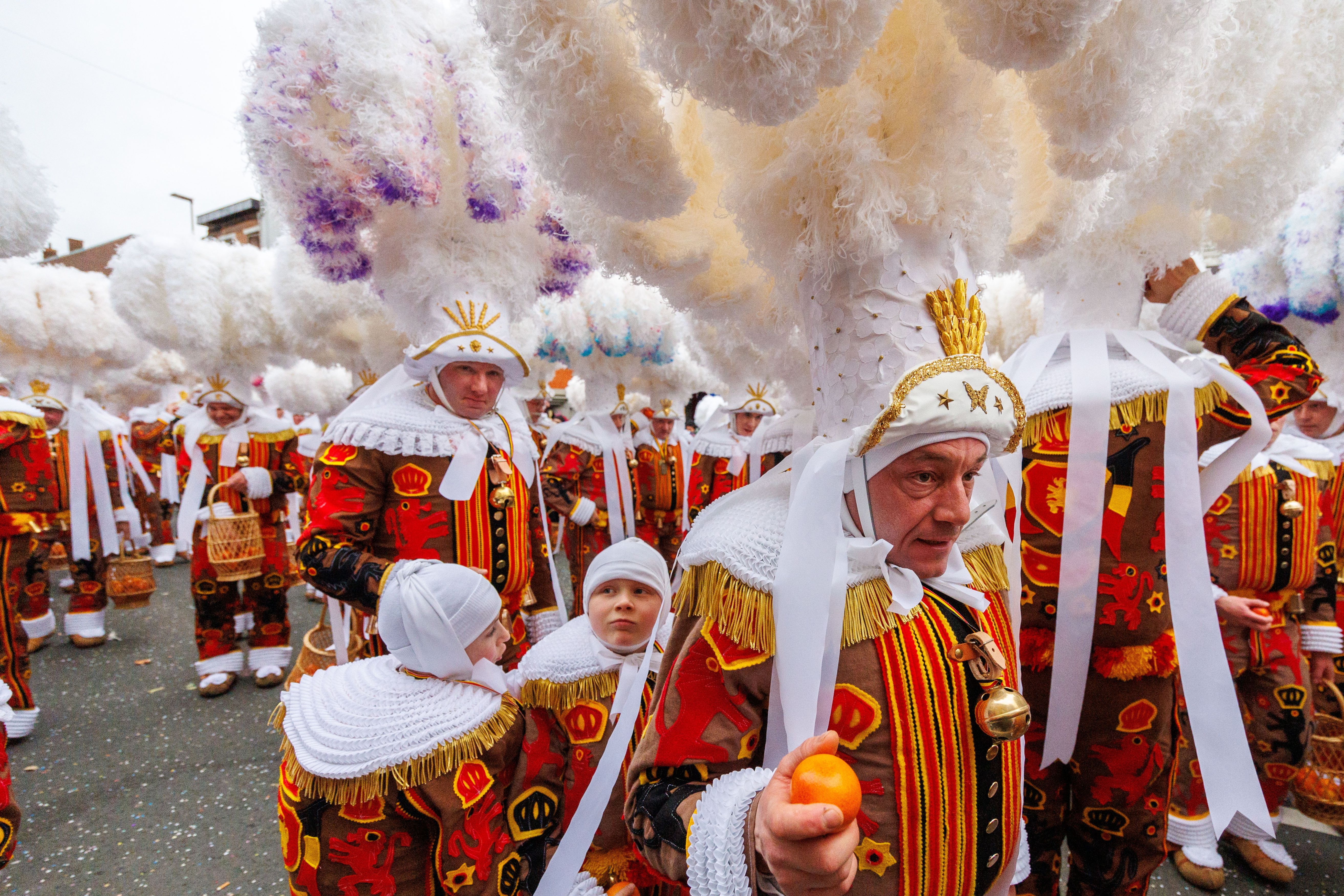 Participants costumed as Gilles of Binche wear hats with plumes of ostrich feathers during the carnival parade in Binche, Belgium, 13 February 2024. On average, 250 to 300 feathers are needed to make the 1.5 meters high 8 to 9 large plumes. The Gilles throw oranges as a gift of good luck. It is an insult to throw them back. Having earned UNESCO's recognition as a Masterpiece of the Oral and Intangible Heritage of Humanity, the Carnival of Binche is in discussion with the organisation to explore ways to make the tradition more inclusive, while respecting the long-standing rules that currently restrict participation to male performers. (Photo by Olivier Matthys/EPA)
