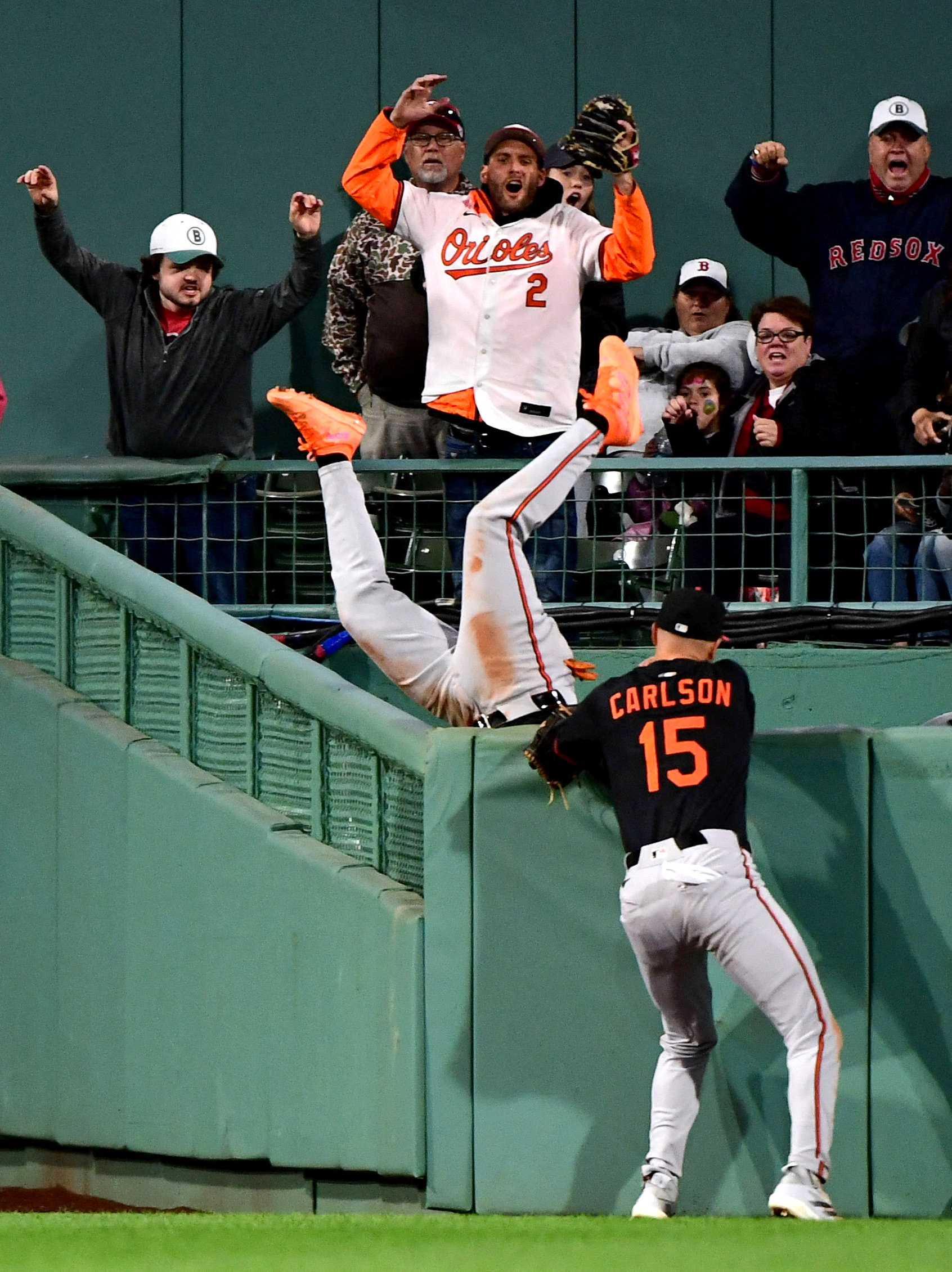 Baltimore Orioles centerfield Jorge Mateo (3) flips into the bullpen after a home run hit by Boston Red Sox first baseman Abraham Toro (29) (not pictured) while right fielder Dylan Carlson (15) looks on during the ninth inning at Fenway Park in Boston, Massachusetts on May 24, 2025. (Photo by Bob DeChiara/Reuters)