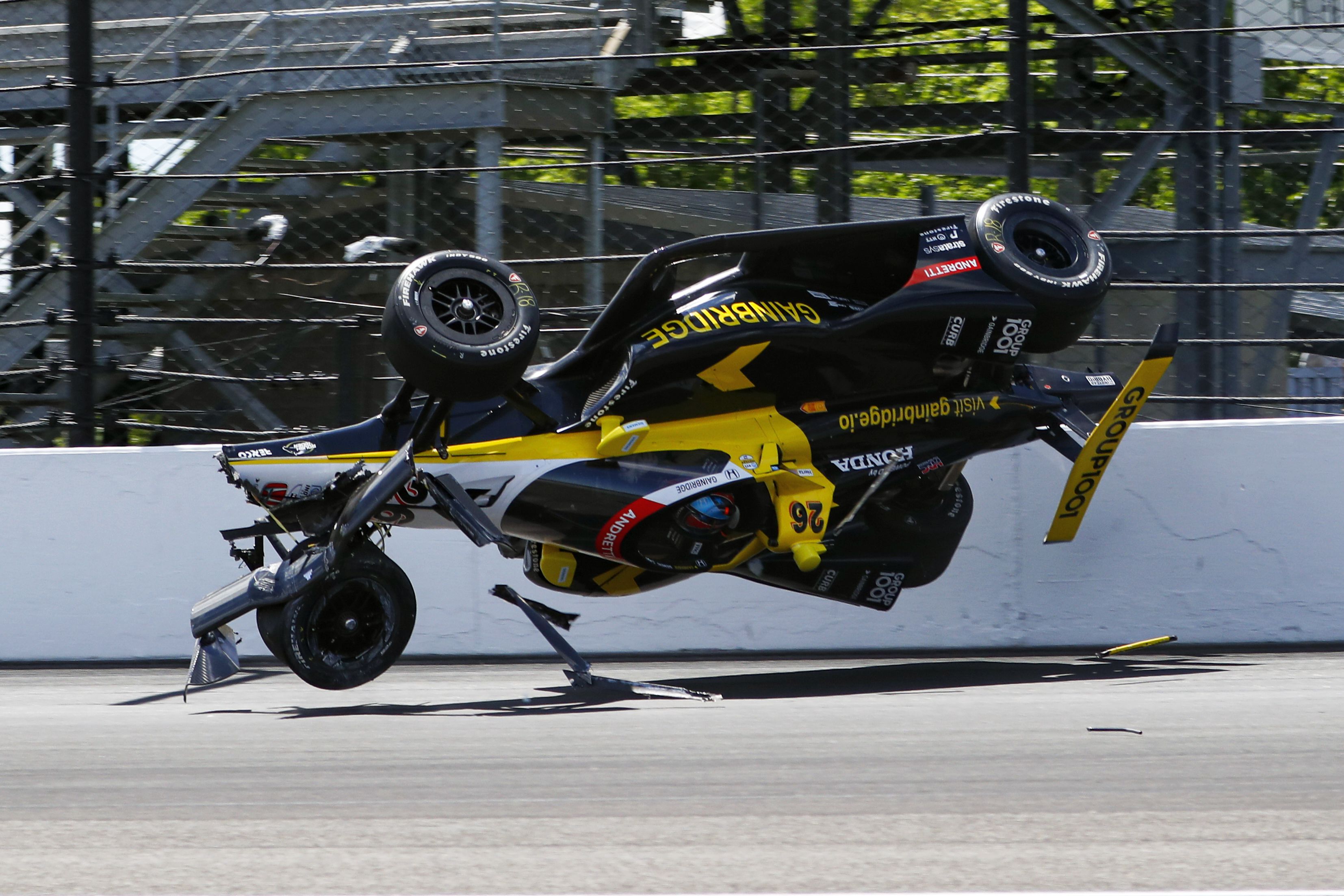 The car driven by Colton Herta goes airborne after hitting the wall in the first turn during a qualification attempt for the Indianapolis 500 auto race at Indianapolis Motor Speedway in Indianapolis, Saturday, May 17, 2025. (Photo by Kirk DeBrunner/AP Photo)